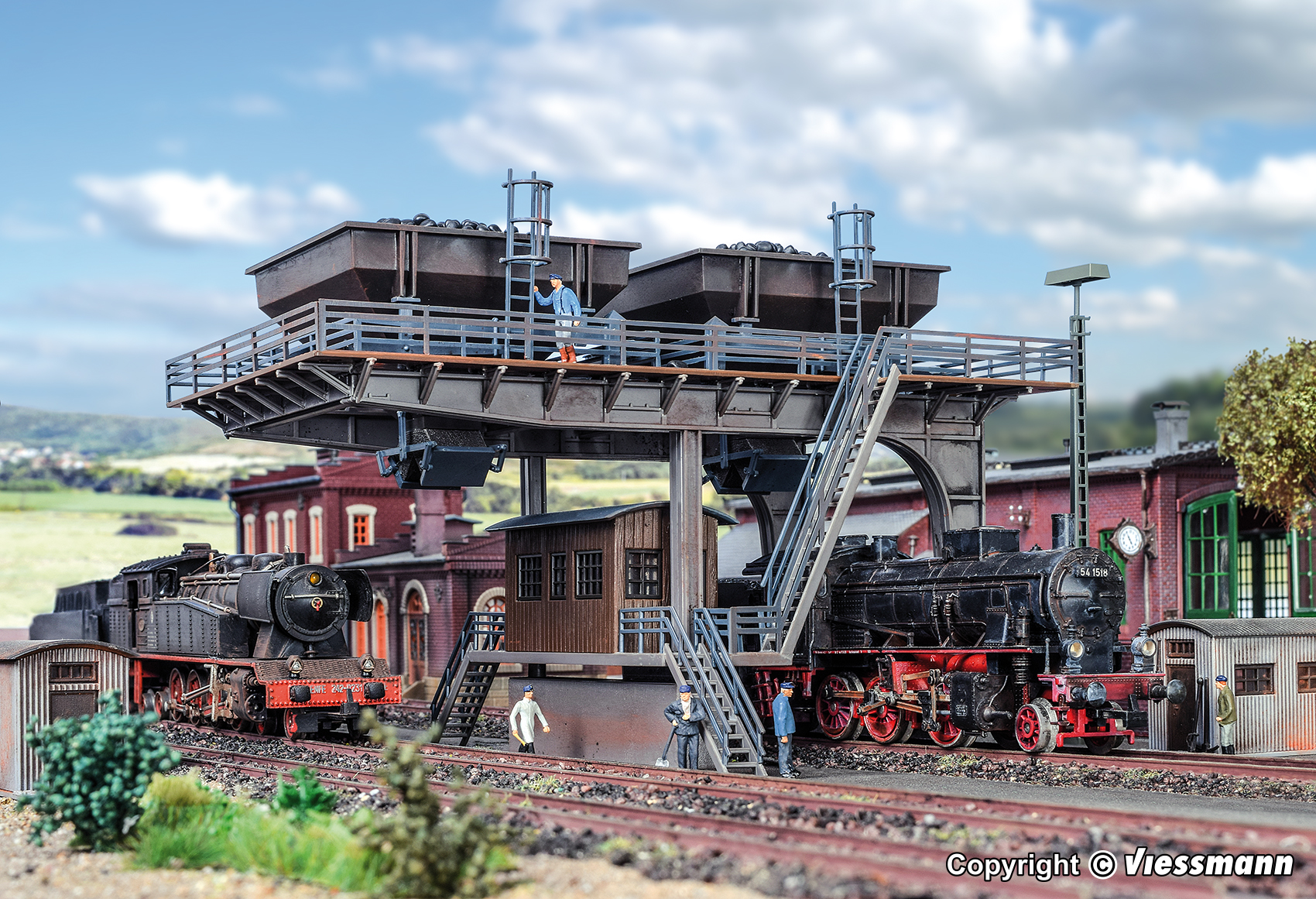 Eine Großbekohlungsanlage war im Zeitalter der Dampflokomotiven im Bahnbetriebswerk unverzichtbar. Noch heute strahlen solche Industriebauten Charme und Anziehungskraft aus. Diese Großbekohlungsanlage hat 2 voneinander unabhängige Kohleabfüllbehälter. Durchfahrtshöhe: 6,7 cm, Gleismittenabstand: 9,5 cm. Maße: L 19,3 x B 17 x H 13,8 cm.