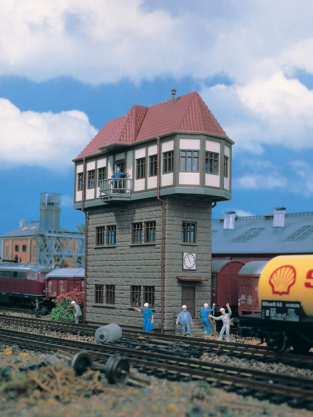 Das Stellwerk Fellbach findet aufgrund seiner kleinen Grundmaße immer einen Platz im Bahnbereich der Modellbahnanlage. Maße: L 15 x B 7,5 x H 17 cm.