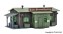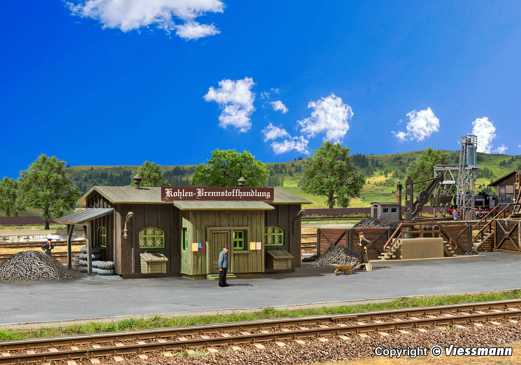 In der Kohlen- und Brennstoffhandlung wird rund um die Uhr gearbeitet. Rußgeschwärzte Gestalten verarbeiten die gerade angekommene Kohlenlieferung. Die innen- und außenliegenden Kohlebansen müssen wieder befüllt werden. In unmittelbarer Nähe zu den Gleise werden dann die Lokomotiven mit neuer Kohle versorgt. Maße: L 8,8 x B 6,9 x H 3,8 cm.