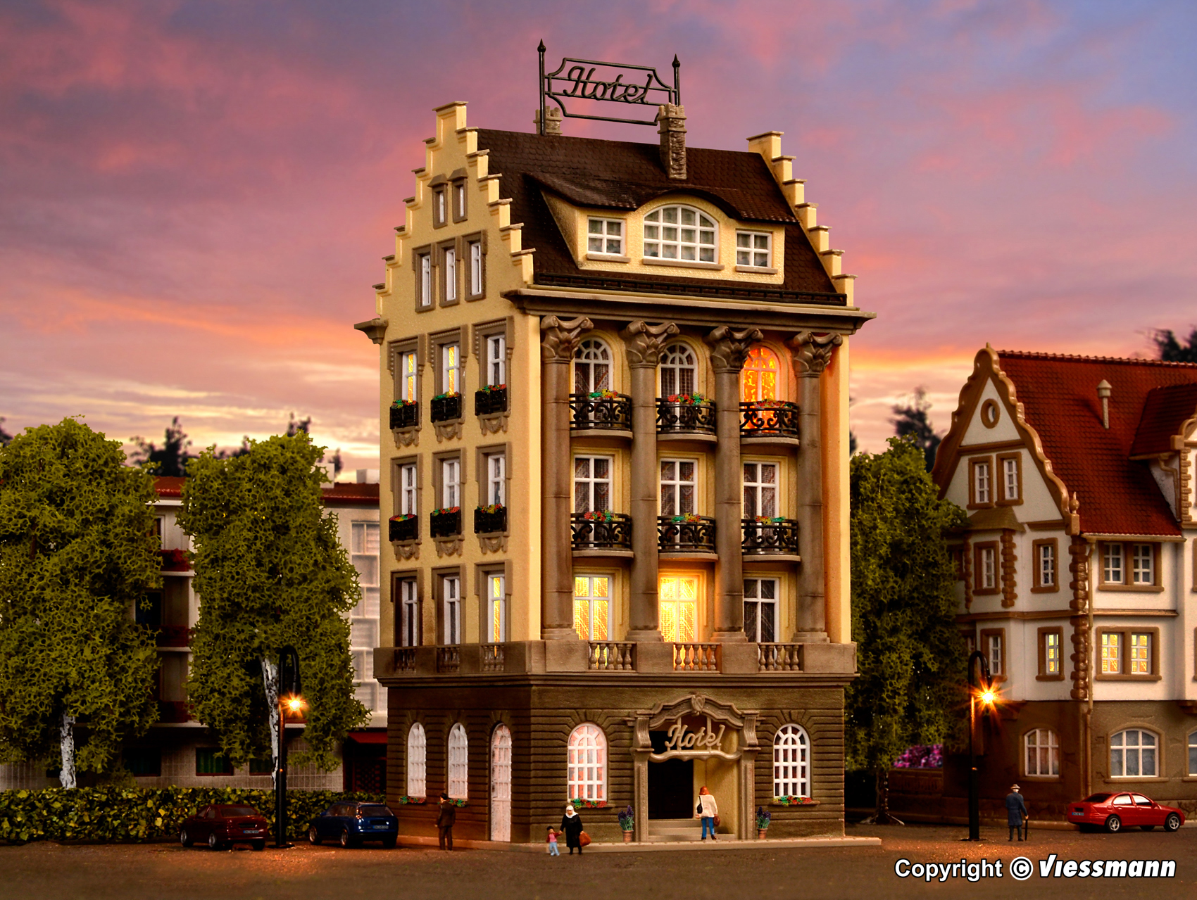 Dieses Modell ist so konstruiert, dass jede Seite eine Sichtseite darstellt. So können Sie z. B. 2 Häuser direkt nebeneinander stellen und sie wirken doch verschieden. Das Gebäude ist mit vielen Details ausgestattet, z. B. Eisengitterverzierungen, zierlichen Balkonen, markanten Säulen und vielem mehr. Mit 3 Bausätzen können Sie z. B. ein Grand Hotel bauen, indem Sie alle 3 aneinander setzen. Maße: L 8,5 x B 8,3 x H 17 cm.