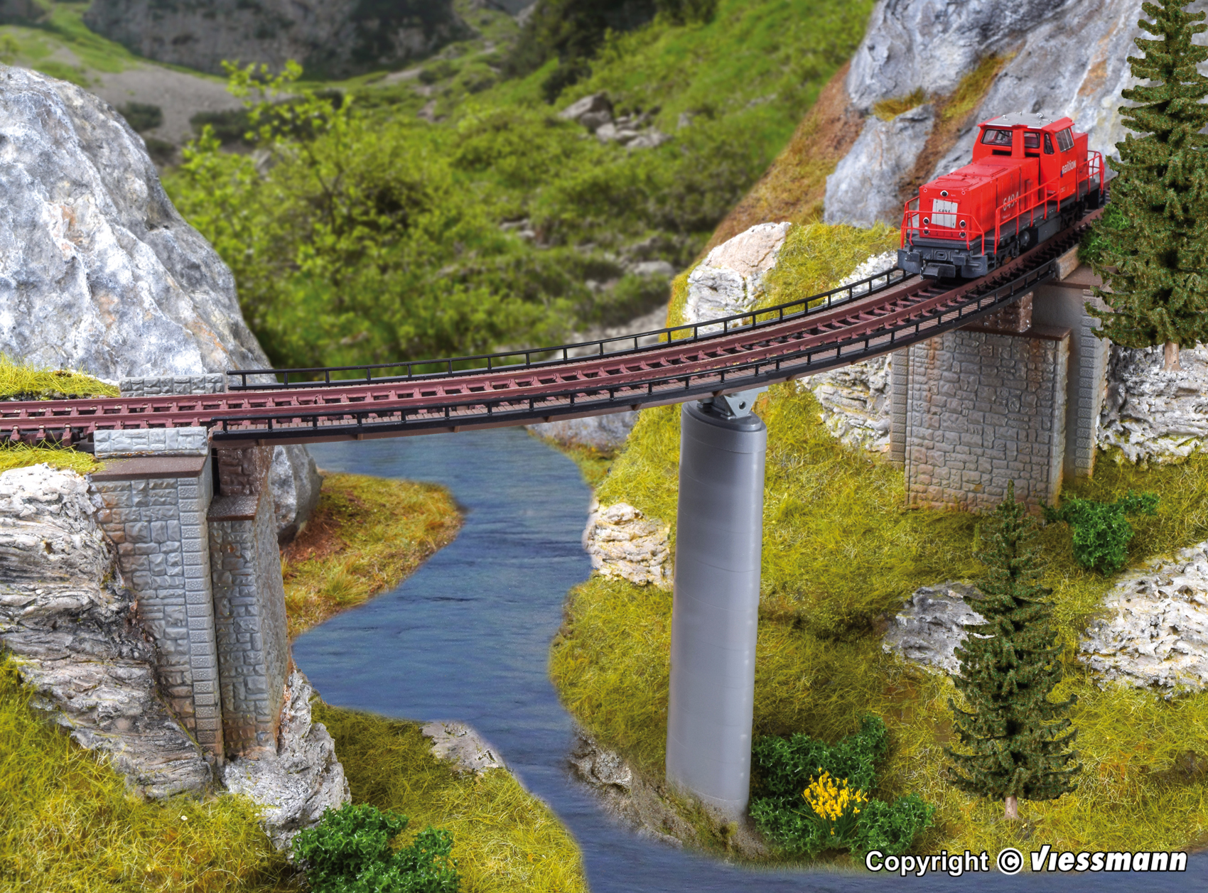 Bausatz. Mit je 2 Brückenauflagen. Geeignet für alle gängigen Gleissysteme in den Spurgrößen N und Z. Radius 18,5 cm. Maße: L 20,5 x B 3 x H 1,7 cm (x2). Fahrbahnbreite: 1,6 cm. Fahrbahnhöhe: 1 cm.