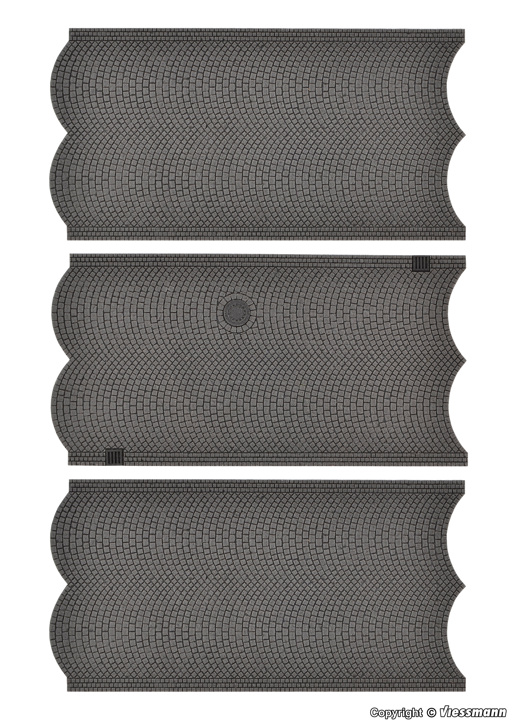 Straßenplatte Kopfsteinpflaster, 3 Stück. Auf einer Platte befinden sich zwei Gullydeckel und ein Kanaldeckel. Die beiden anderen sind ohne Kanal- oder Gullydeckel. Maße: 15 x 8 cm.