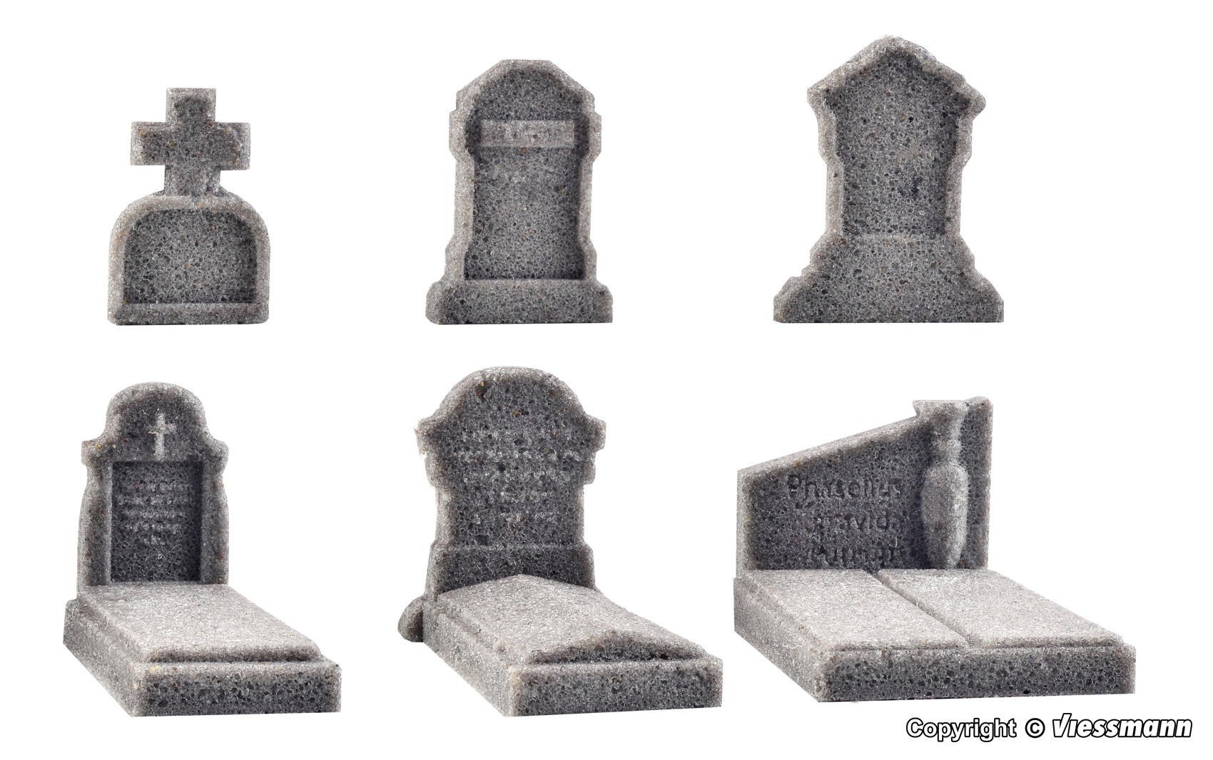 Dieses Deko-Set aus der Steinkunst-Serie besteht aus wetterfestem Sedimentverbundwerkstoff. Dieser Werkstoff erzeugt eine unübertroffen realistische Steinoberfläche. Das Set beinhaltet 6 Grabmale zur Ausgestaltung. Auf der Modellbahnanlage ist es vielseitig verwendbar, z. B. für die Vollmer Friedhöfe Art. 43860 und 43861.