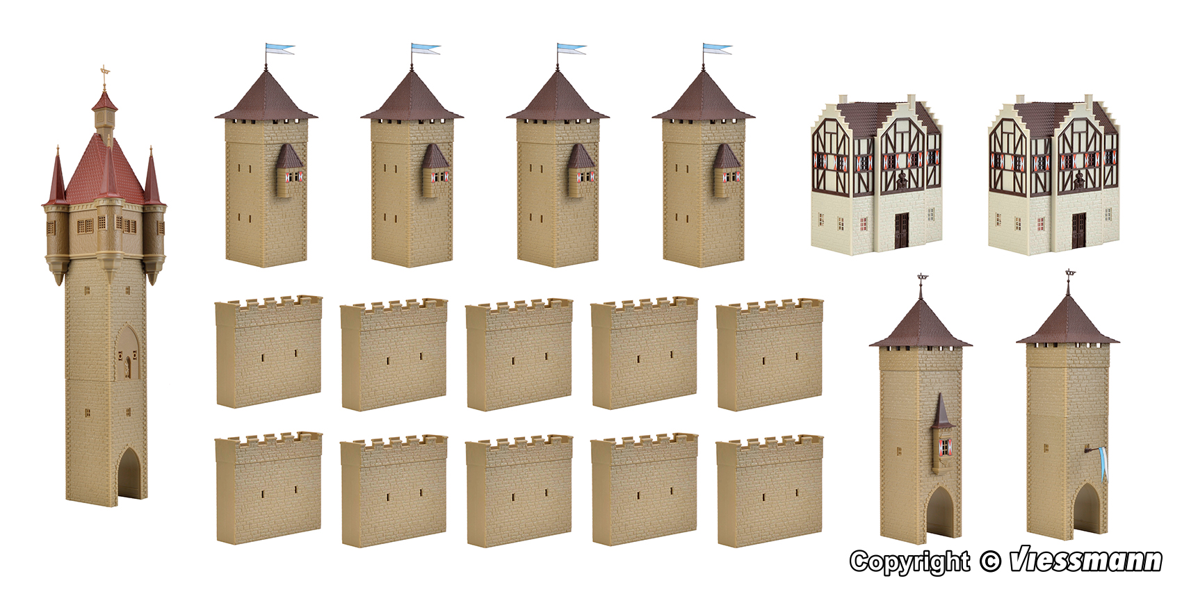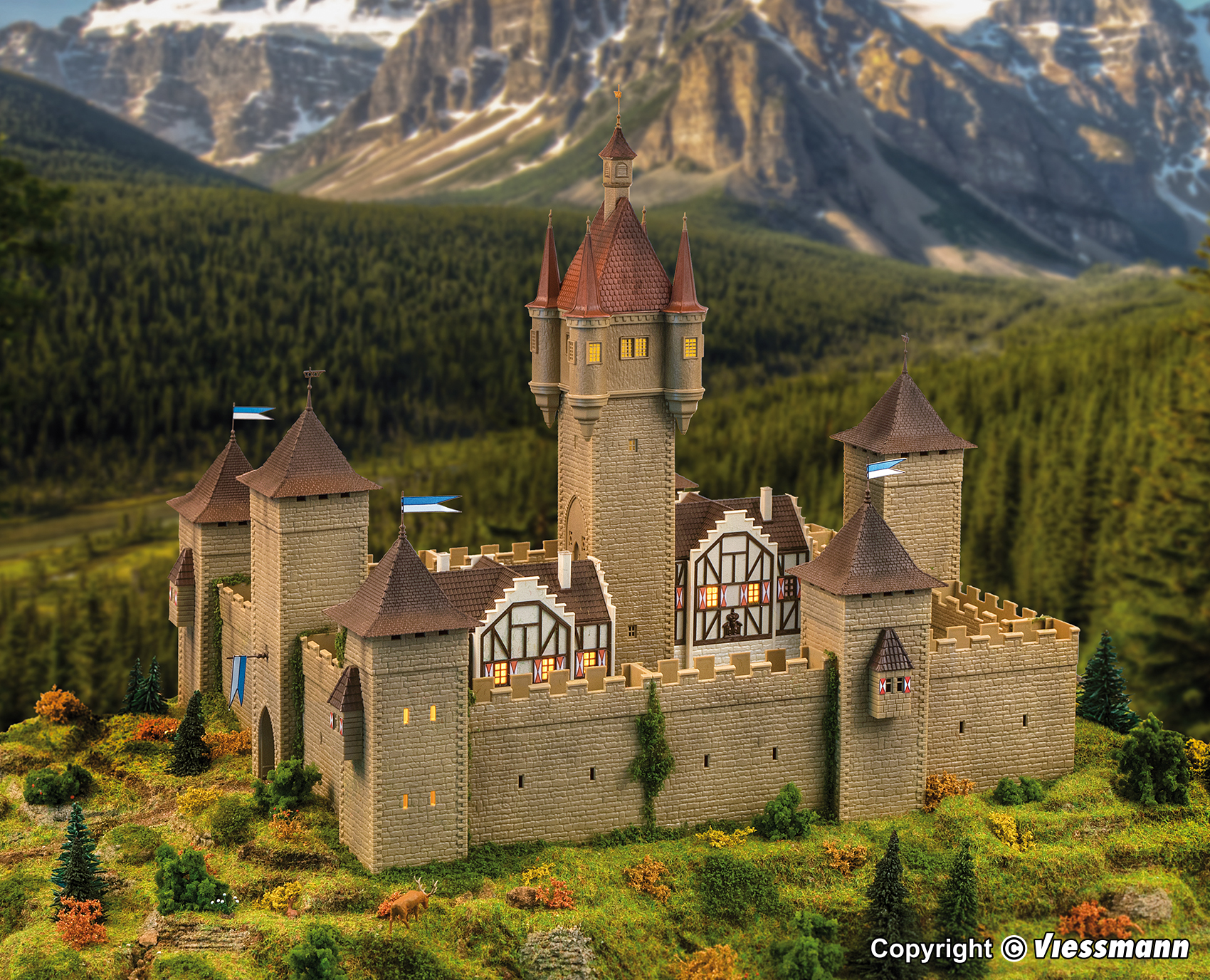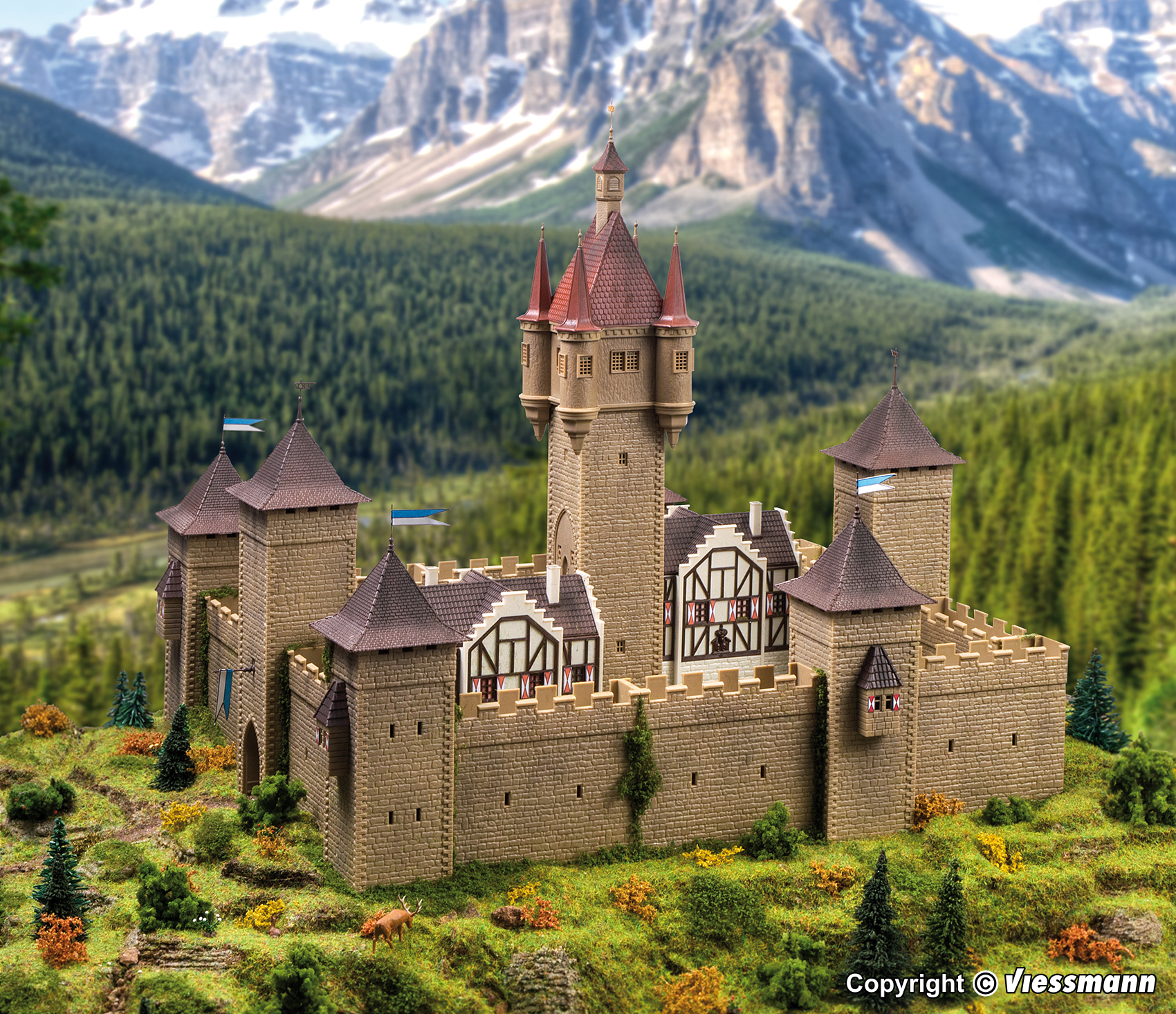 Diese Burg ist ein echter Blickfang auf der Modellbahnanlage. Ob dezent im Hintergrund oder auf Augenhöhe in der Nähe des Betrachters ? dieser Bausatz macht überall eine gute Figur. Er ist flexibel aufbaubar und aufgrund der einfachen Modulbauweise besonders für Einsteiger geeignet. Die passende LED-Beleuchtung für ein Fenster liegt dem Bausatz bei. Sie ist einfach zu montieren und genau auf das Modell abgestimmt. L 56 x B 31 x H 37 cm.