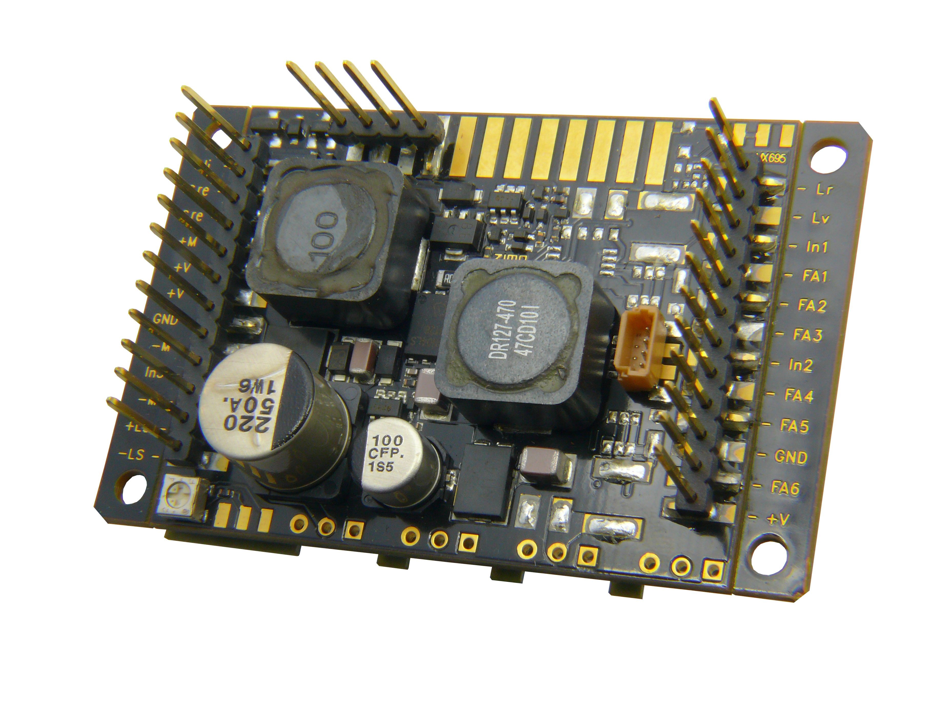 Großbahn-Sounddecoder 1x NV. Details: Maße: 51 x 40 x 15 mm, 6 A, 8 FA, 28 Stifte, Servo, Energiespeicher