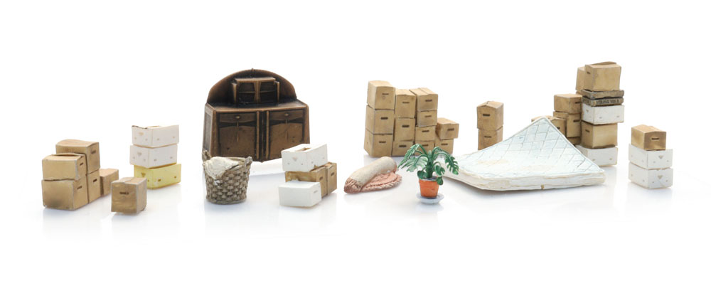 Umzugskartons und Hausrat - 1:87 Fertigmodell aus Resin, lackiert