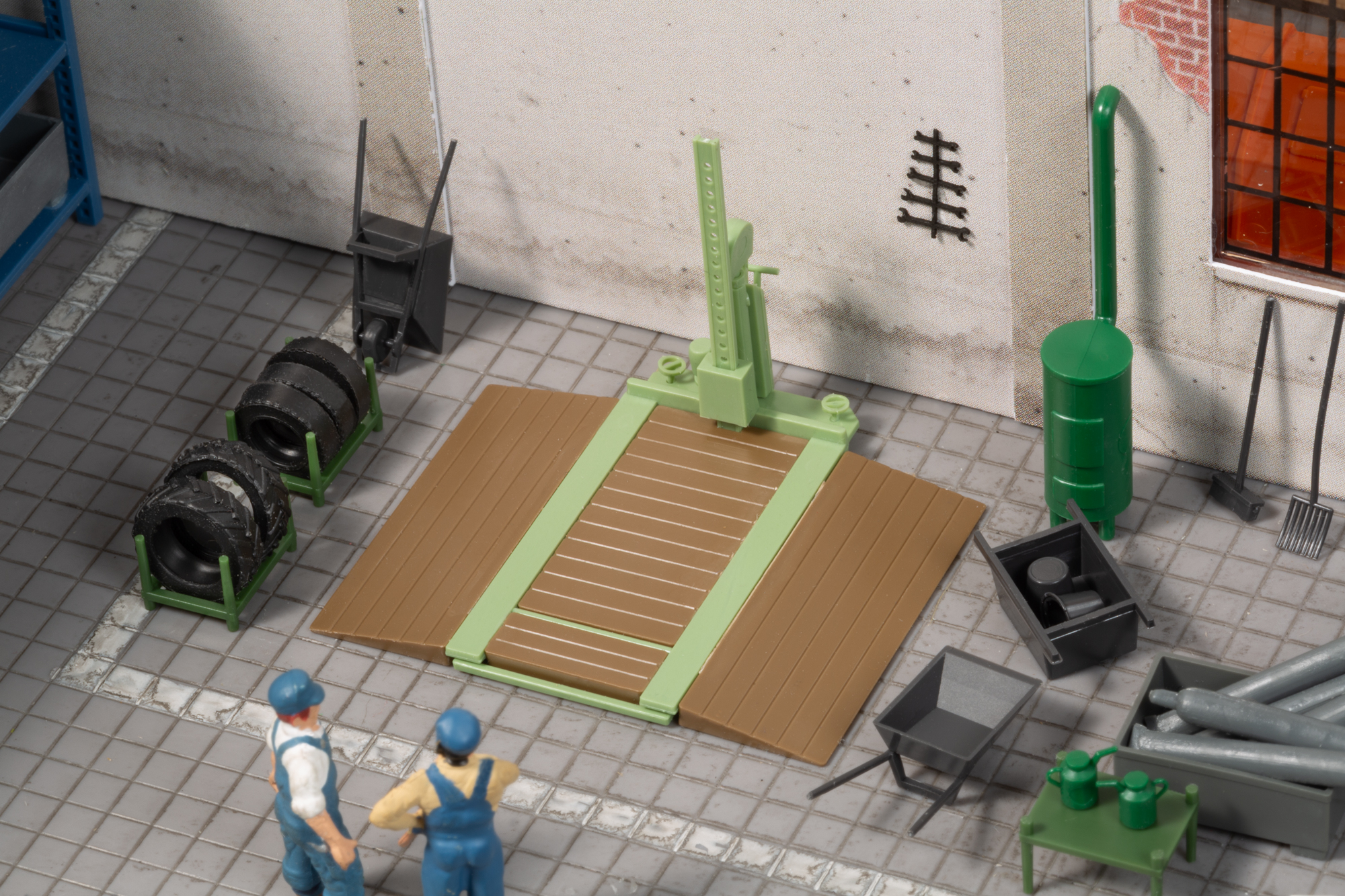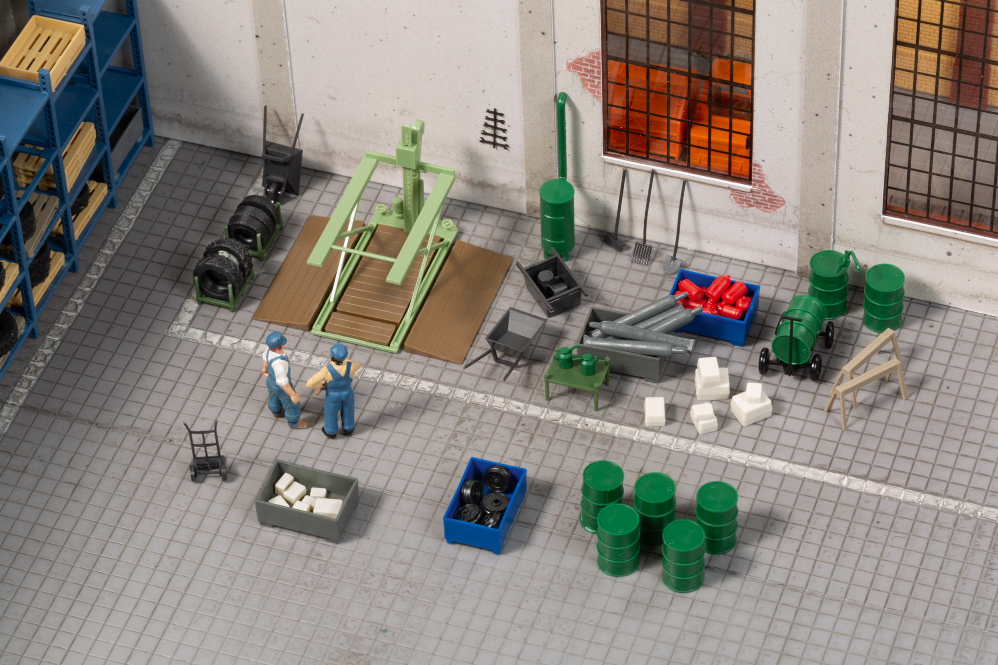 Ausstattung Kfz-Werkstatt - Umfangreiche Ausstattung für Kfz-Werkstätten: eine Scherenhebebühne, ein Ofen, mehrere Fässer, ein Fasswagen, 4 Transportkisten, mehrere Reifen nebst Felgen, Flaschen, Gläser, Gasflaschen, Kisten, Böcke und Werkzeug, auch in Lasercut, lassen keine Wünsche mehr für einen Modellmechaniker offen!