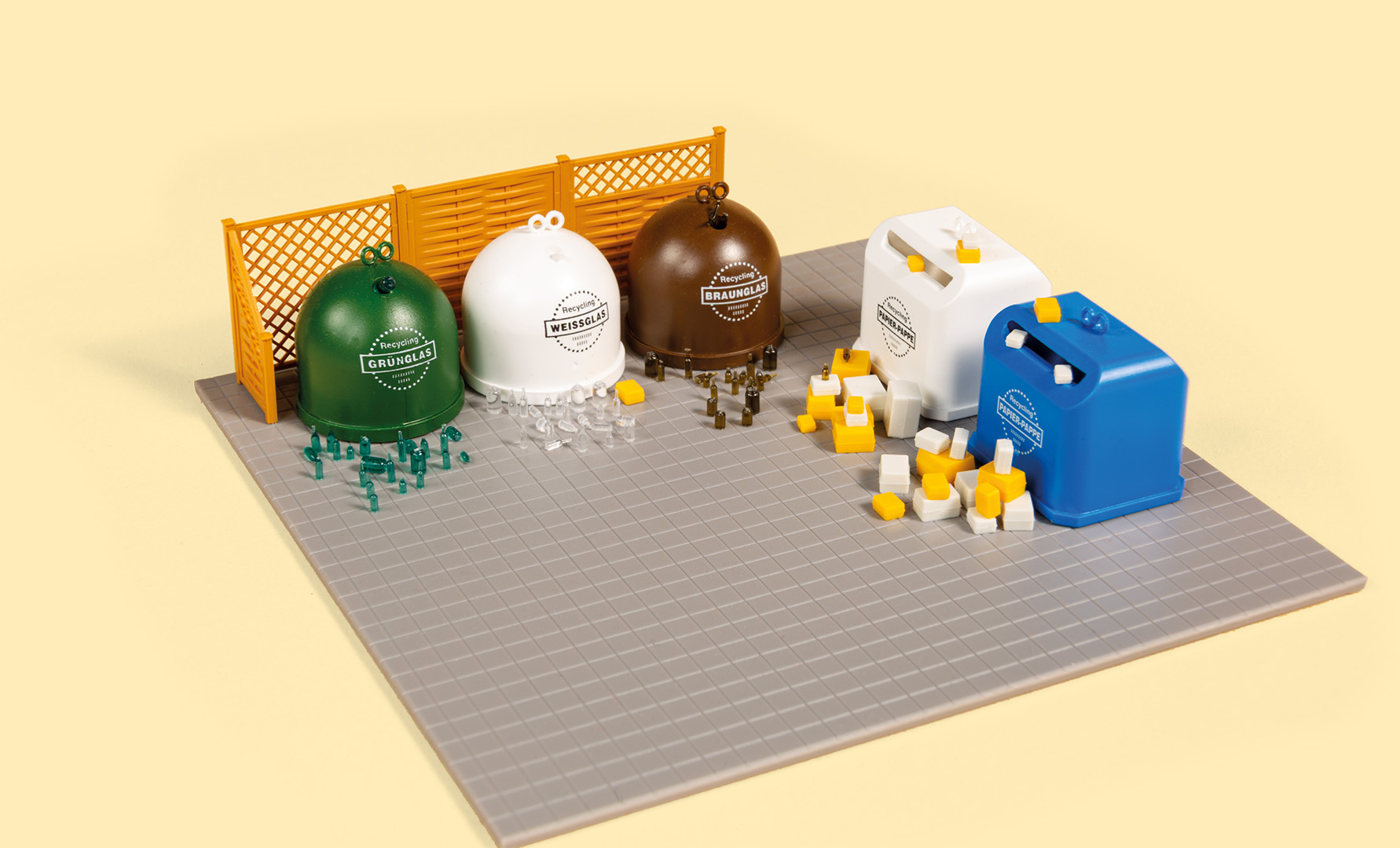 Kleiner Bausatz, der auf der Anlage schnell eine typische Alltagsecke entstehen lässt. Mit Sichtschutzzaun, 2 Papier-Containern und 3 Flaschen-Containern. Papierbündel sowie Flaschen in verschiedenen Farben liegen ebenfalls bei.