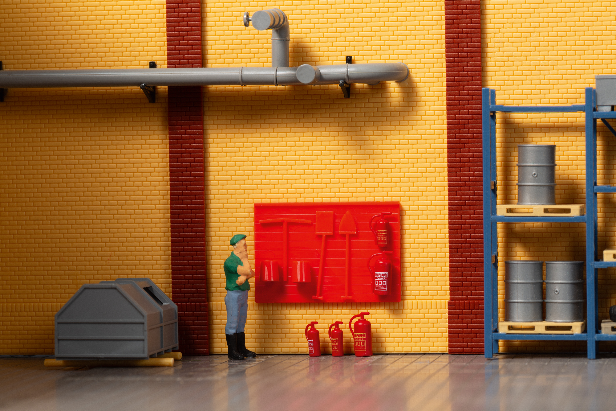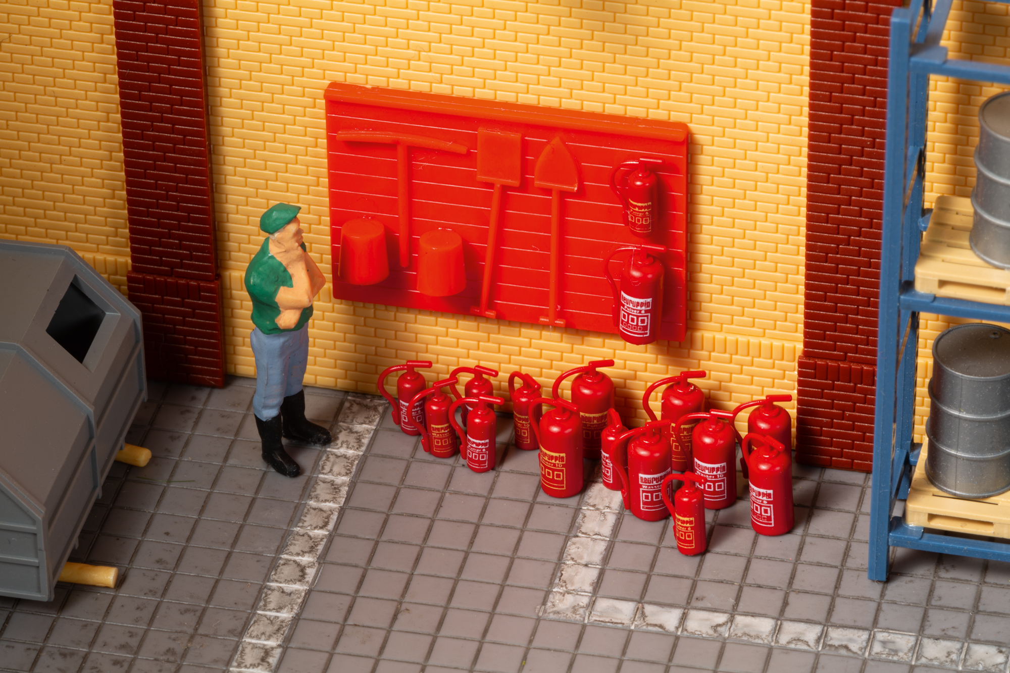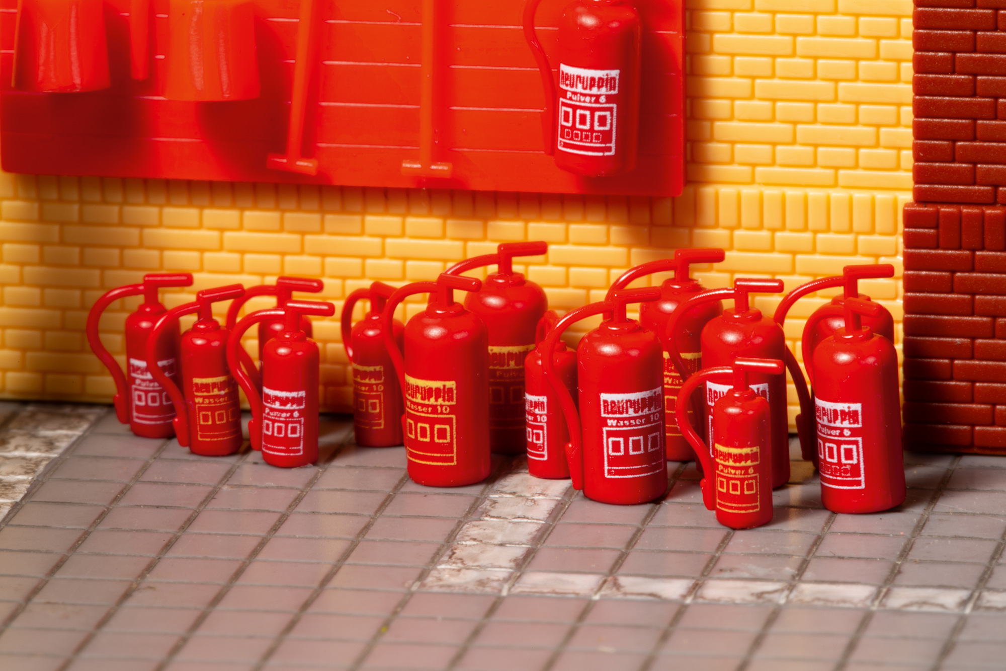 Feuerlöscher - 8 große und 8 kleine Handfeuerlöscher, weiß bzw. gelb bedruckt sowie eine Feuerlöschgerätetafel.