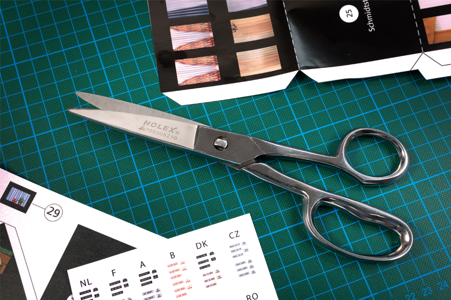 Eine gute Schere gehört in jede Modellbauwerkstatt. Diese besonders stabile Schere ist vielseitig einsetzbar. Sie hat einen langen Schneidebereich, wodurch lange gerade Schnitte problemlos ausgeführt werden können. Die Klingen sind geriffelt. So ist es einfach, dickere Materialien zu schneiden, weil das Material nicht wegrutscht. Die Schere ist für Papier und Karton geeignet, schneidet aber auch dünnere Kunststoffplatten und sogar Messing-, Neusilber- und Kupferblech bis zu einer Stärke von 0,3 mm. Für eine gründliche Reinigung kann die Schere ohne Werkzeug zerlegt werden, da die Klingen mit einem Kreuzgelenk geführt sind. Mit einer Stellmutter können die Schneiden nachjustiert werden.