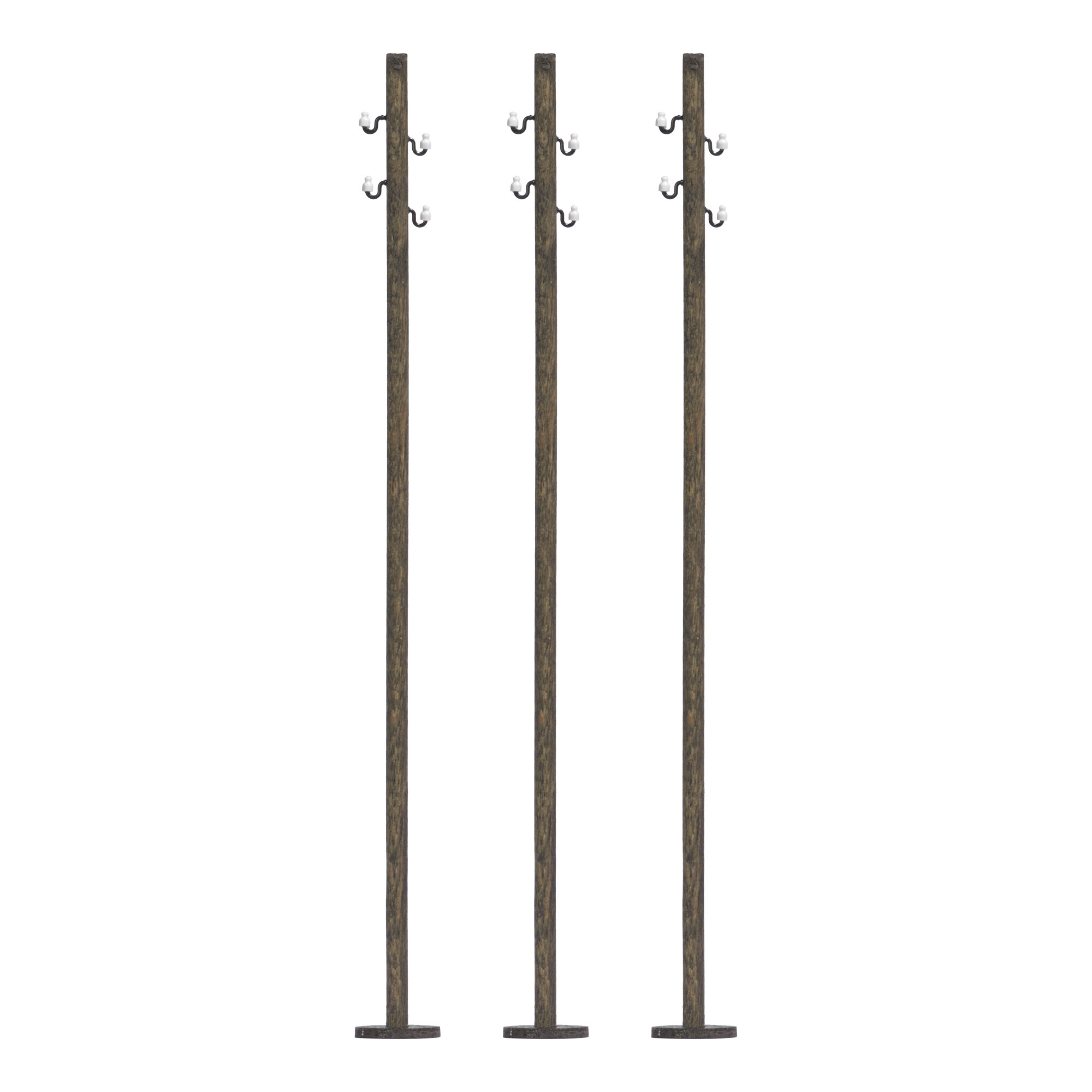 3 gerade Freileitungsmasten aus Echt-Holz mit filigranen Isolatoren. Fertigmodelle. Passende Ergänzung: Freileitung Nr. 1750.