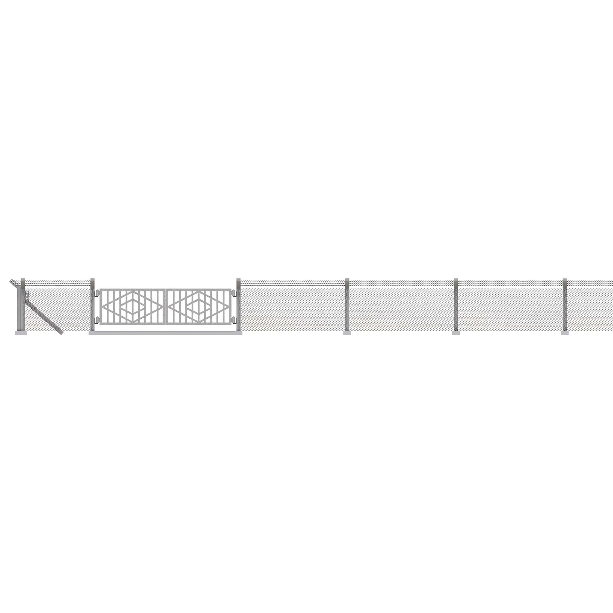 Vielseitig einsetzbarer Maschendrahtzaun für Industriege lände, Fabriken, militärische Anlagen usw. Betonpfosten mit Übersteigschutz. Großes Metalltor mit zwei Flügeln zum Öffnen.