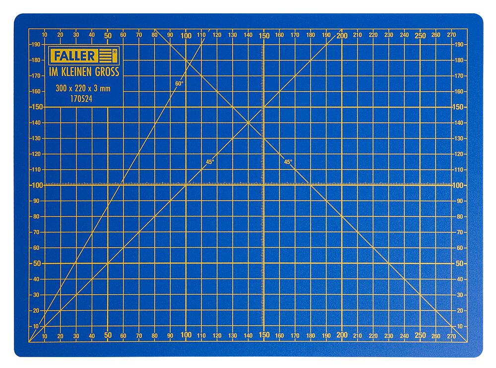 Schneidematte. Schützt die Tischoberfläche und schont zugleich die Klingenschärfe Ihres Bastelmessers. Die langlebige, hochwertige Unterlage ist mit einer horizontalen und vertikalen cm-Rasterung und dem FALLER-Logo bedruckt. Durch den Sandwichaufbau des Materials selbstschließend nach Schnitten. Maße: 300 x 220 x 3 mm (A4).