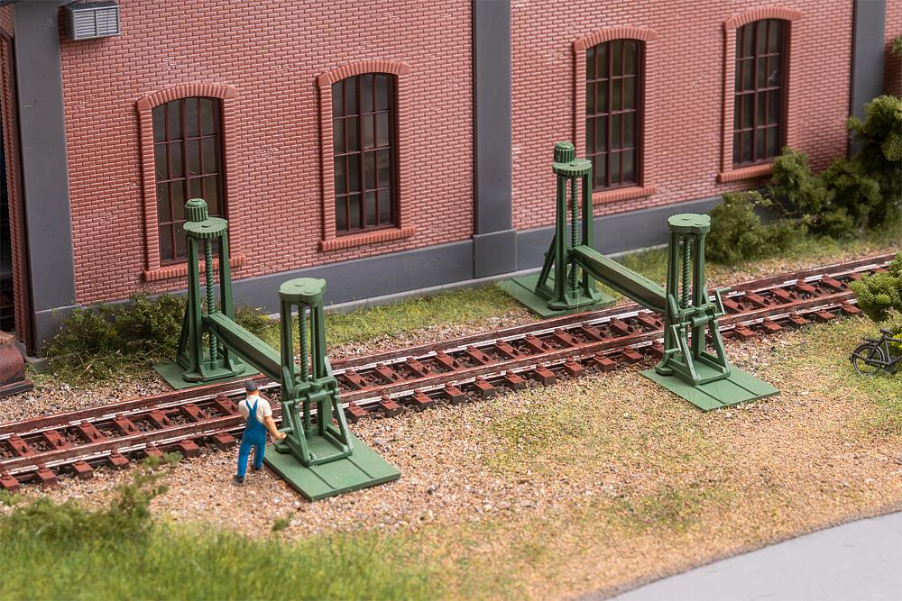 Mit diesen zwei Spindelhebeböcken lassen sich Waggons mühelos zum Warten aufbocken - so werden Reparaturen und Pflegearbeiten für die Miniaturarbeiter zum Kinderspiel!