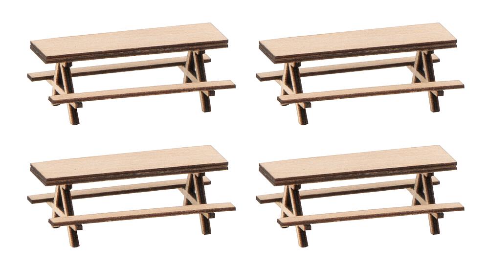Pausenzeit! Vierer-Set mit im Lasercut-Verfahren hergestellten Picknicktischen mit Bänken.