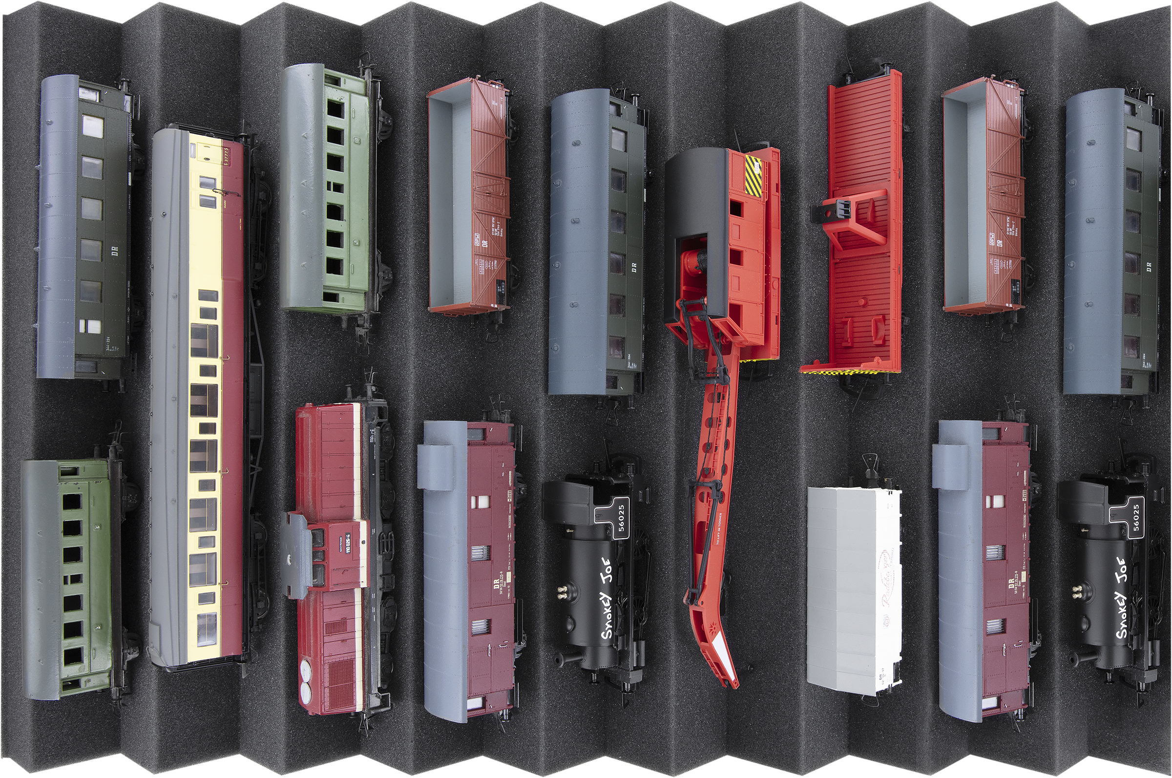Die vielseitige Schaumstoffeinlage zum Aufbewahren, Transportieren, Präsentieren und Reparieren ihrer Modelle in Spur H0. Passend für diverse Euroboxen (z. B. Auer Eurobehälter 60 x 40)