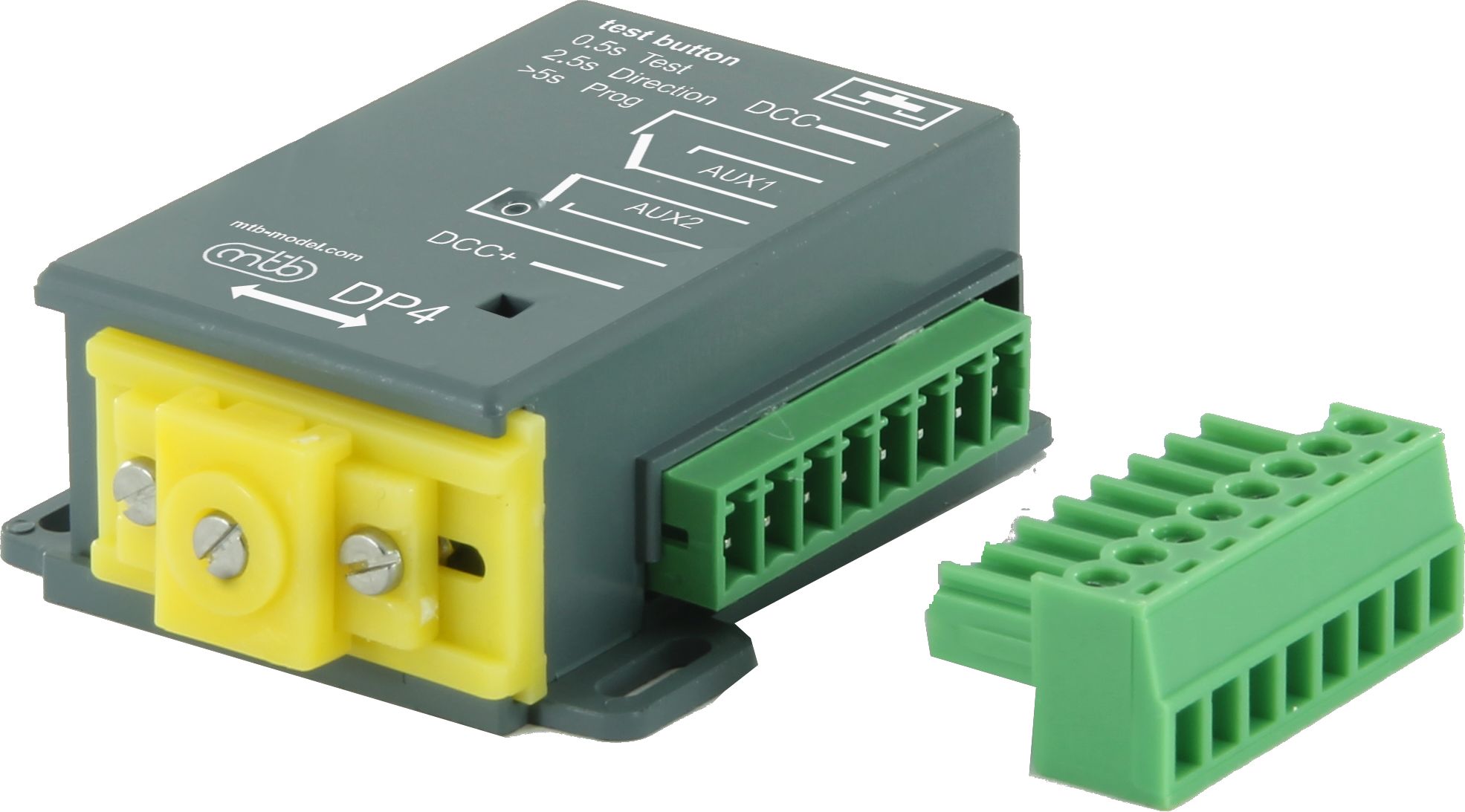 Die DP-Weichenantriebe sind mit einer DCC-Schnittstelle ausgestattet, die sowohl den Befehlsempfang als auch die Stromversorgung des Antriebs ermöglicht. Sie verfügen zudem über die Hilfsschalter AUX1 und AUX2 zur Anzeige und zur Stromversorgung des Herzstücks. Eine LED-Anzeige dient zur Statusanzeige, während ein Hilfsknopf für die Konfiguration und zum Testen verwendet wird. Für zusätzliche Anwendungen ist der Antrieb mit zwei Umschaltkontakten mit einer Kapazität von 1 A ausgestattet. Endschalter gewährleisten das Erreichen der Position auch nach Wiederherstellung einer unterbrochenen Stromversorgung.