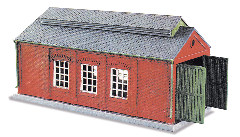 Kunststoffbausatz eines attraktiven eingleisigen Schuppens mit vorgefärbtem Dach, Wänden und Türen. Mehrere Bausätze können leicht zusammen verwendet werden, um eine größere Lokomotivanlage zu schaffen.