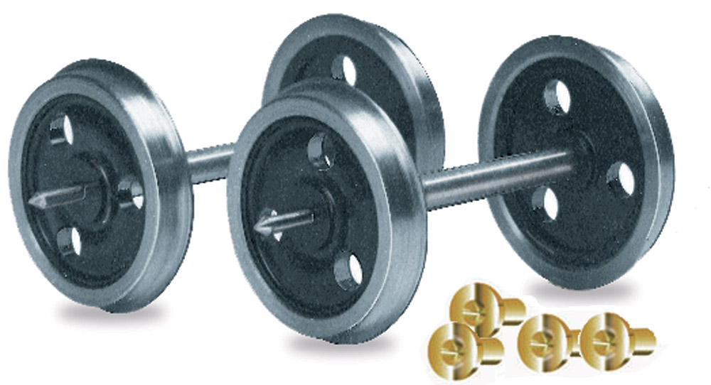 0 Gauge Chassis Kits und Zubehör für Scratchbuilder und Kit-Modifikation. Diese Packung enthält ein Paar Steckachsen aus Metall mit Lagern und 3-Loch-Scheibenräder mit freilaufenden Metallfelgen auf gegossenen Mittelstücken.