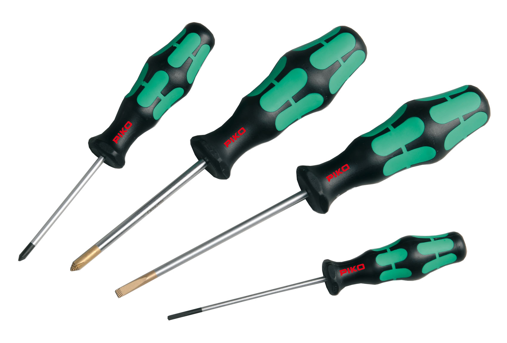Je ein Kreuzschlitz-Schraubendreher Größe 0 und 1 sowie je ein Schlitz-Schraubendreher 2,5 mm und 4 mm, für alle im PIKO G Sortiment verbauten Schrauben