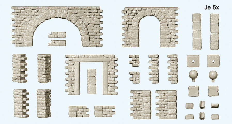 Bruchsteinmauern mit Toröffnungen und Rundbogen, Eckpfosten. Zubehör. Beidseitig strukturierte Mauerteile. Kombinationsbausatz passend zu Bruchsteinmauern 18215/18219