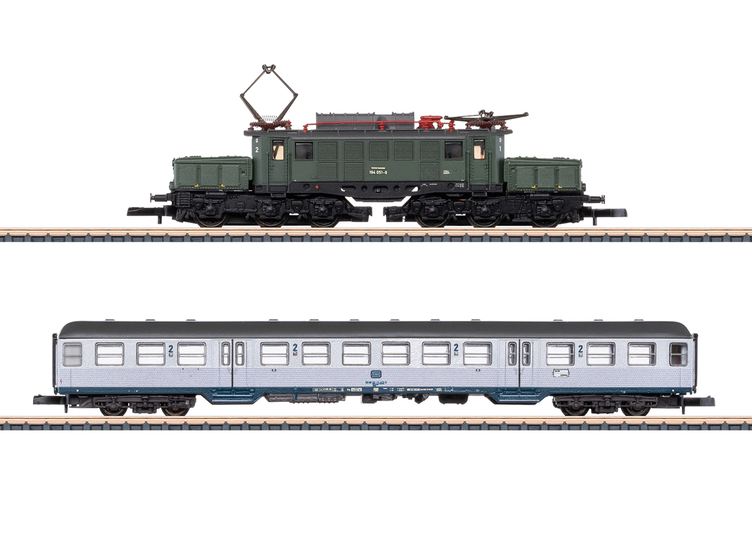 Nahverkehrszug mit der Baureihe 194 - Auf der Geislinger SteigeWer kennt Sie nicht, die mächtigen Güterzuglokomotiven der Baureihe 194? Gebaut ab 1940, galten sie lange als optimale Zugpferde im schweren Güterzugdienst. Erst im Mai 1988 wurden die letzten Exemplare bei der DB verabschiedet. Davor leisteten die wuchtigen Sechsachser mit ihren markanten Vorbauten unter anderem zahllose Schiebedienste auf den Rampen der Mittelgebirge, wie etwa an der Geislinger Steige, die 2025 auf 175 Jahre Schienenverkehr zurückblicken kann. Zusätzlich zum dortigen Schiebebetrieb, der im Jahr 1987 endete, sah der Umlaufplan für die 194 auch gemütlichere Aufgaben vor, im Nahverkehr. Dabei hatten die Schwerathleten plötzlich n-Wagen zu ziehen, besser bekannt als Silberlinge, weil die Wagenkästen aus gebürstetem Edelstahl gefertigt waren und ein auffälliges, silbrig glänzendes Pfauenaugenmuster aufwiesen. Zwischen 1958 und 1980 entstanden gut 5000 Exemplare. Später erhielten sie das jeweils aktuelle Farbschema von DB Regio. Heute sind sie nicht mehr im Einsatz. Umso schöner ist es, wenn auf der Anlage eine 194 mit zwei oder drei Silberlingen am Haken ihre Runden drehen kann. Ganz wie damals an der Geislinger Steige.Vorbild: Elektrolokomotive Baureihe 194 und Nahverkehrswagen Bnb 720 der Deutschen Bundesbahn im Zustand der Epoche IVc auf der Geislinger Steige.Modell: Lokomotive mit Glockenankermotor. Elektrischer Oberleitungsbetrieb. LED-Spitzensignal mit warmweissen LED, mit der Fahrtrichtung wechselnd. Beide Vorbauten aus Metall. Beide Drehgestelle angetrieben. Wagen mit eingebauter Inneneinrichtung. Feine und vorbildgerechte Farbgebung und Beschriftung an beiden Fahrzeugen. Länge über Puffer ca. 207 mm. Im Lieferumfang ist ein Booklet zur Geschichte der Geislinger Steige.