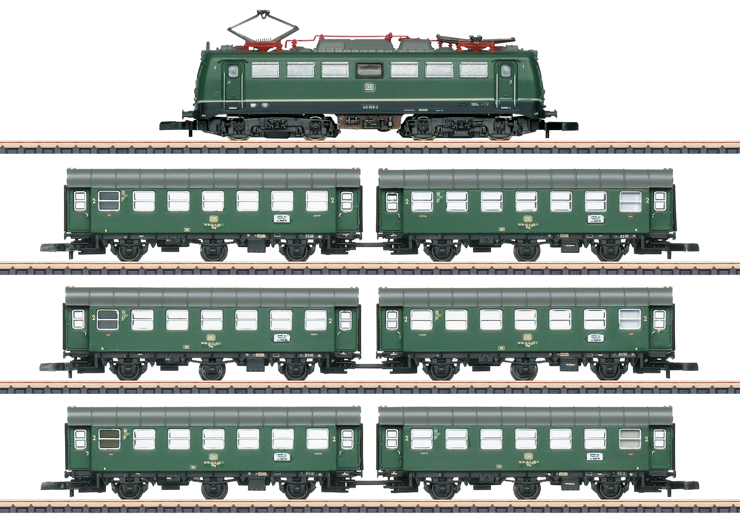 Zugpackung Ferienreisezug mit BR 140 - Ab in die FerienVorbild: Elektrolokomotive BR 140 chromoxidgrün und 3 Personenwagen-Paare aus 3-achsigen Umbauwagen B3yge der Deutschen Bundesbahn (DB). Alle Fahrzeuge im Zustand der Epoche IV um 1972.Modell: Elektrolok BR 140 mit Glockenankermotor und warmweisser LED-Spitzenbeleuchtung. Die dazu passenden Wagen-Paare sind jeweils fest gekuppelt und verfügen jeweils am Ende über Systemkupplung. Länge über Puffer ca. 450 mm.Im Vorbild wurden solche Züge auch häufig in Doppeltraktion bewegt, aus Zugkraftgründen auf Steigungenempfehlen wir ebenfalls ein weiteres Modell aus der Epoche vorzuspannen.