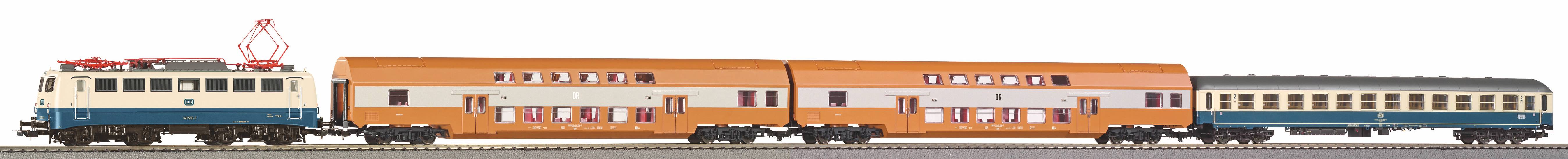 E-Lok BR 140 der DB mit Personenzug DB/DR bestehend aus 2 Doppelstockwagen der DR und einem Schnellzugwagen der DB,