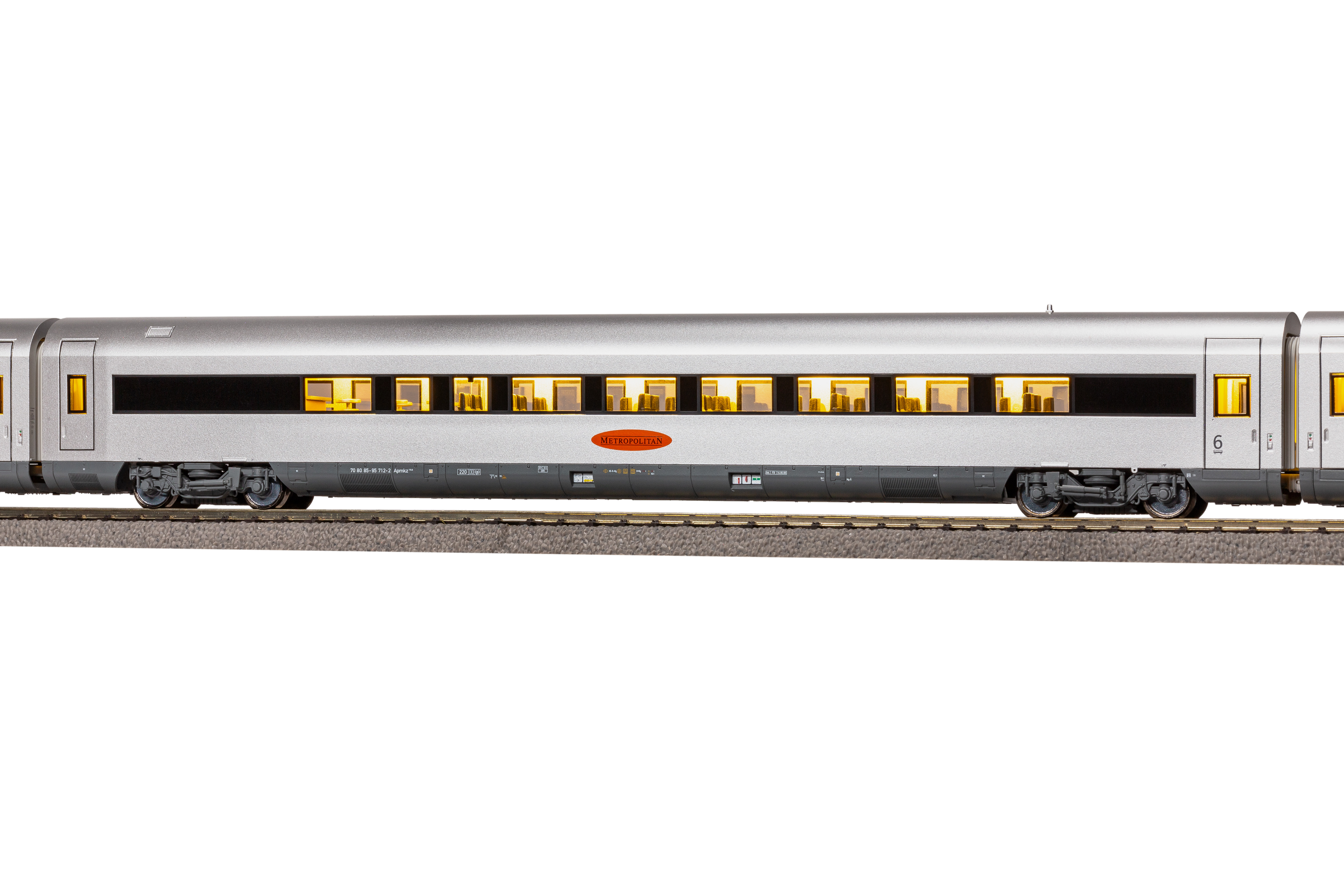 Von außen überzeugen die Modelle durch ihr elegant anmutendes Erscheinungsbild, welches dem des Vorbildes in nichts nachsteht. Durch die perfekt bündig eingesetzten, glasklaren Fenster fällt der Blick in den Innenraum. Alle Wagen verfügen über eine individuelle, passend abgestimmte Inneneinrichtung. Ein weiteres Highlight sind die scharf gravierten Drehgestelle und die detailliert nachgebildeten Wagenböden. Plastisch anmutende Gravuren sowie eine vorbildgerechte Lackierung mit konturenscharfen Beschriftungen runden den äußeren Eindruck perfekt ab. Auf der Anlage befördert die kraftvolle BR 101 die Wagengarnitur seidenweich über die Gleise. Alle Wagen verfügen zudem über eine stimmige indirekte Innenbeleuchtung, um ein harmonisches Ambiente zu schaffen.Das vierteilige Zugset besteht aus einer Schnellzuglokomotive Baureihe 101, einem Schnellzugwagen Apmz 116.0 Ordnungsnummer 1, einem Schnellzugwagen Apmkz 116.6 Ordnungsnummer 3 und einem Schnellzug-Steuerwagen Apmbzf 116.8 Ordnungsnummer 7.