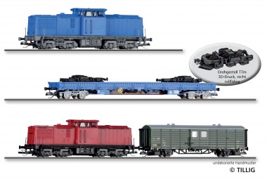 Einmalauflage 2025 - Güterzugset HSB-Loküberführung der Eisenbahn-Bau- und Betriebsgesellschaft Pressnitztalbahn mbH (PRESS), bestehend aus einer Diesellokomotive BR 204 der PRESS, einem Dummy BR 199.8 der HSB, einem Gerätewagen und einem Niederbordwagen Res mit Beladung, Ep. VI