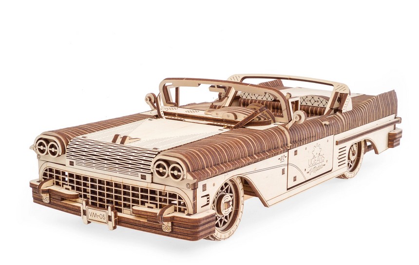 Der Bausatz für das mechanische Modell Traum Cabriolet VM-05 von Ugears ist ein hochdetaillierter und extrem realistischer Tribut an die Highlights der Automobilindustrie der 50er Jahre. Die Zeit der prächtigen Luxusautos und Cabrios und natürlich Rockabilly-Musik, Swing-Kleider und Bobby-Socken.