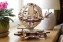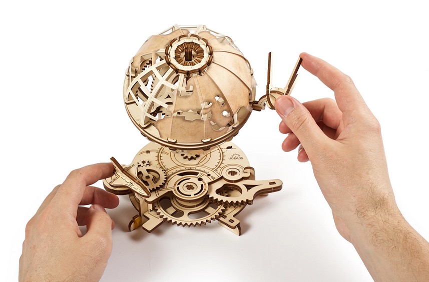 Das Hauptmodul des Models besteht aus zwei Teilen: der Globus, sowie die Plattform des Mechanismus. Die Sphäre des Globus sitzt auf einer Achse, welche genauso geneigt ist wie die Achse unserer Erde. Wie die meisten Ugears Modelle ist auch dieser Globus beweglich durch einen Gummibandmotor. Der Mechanismus wird komplett in Gang gesetzt, wenn man den Hebel an der Grundfläche einmal komplett im Uhrzeigersinn dreht. Sobald man den Hebel loslässt, beginnen die Zahnräder ihre Arbeit. Wenn es langsamer rotieren soll, kann man den Globus per Hand drehen und zusehen, wie die Kontinente vorbeischweben.