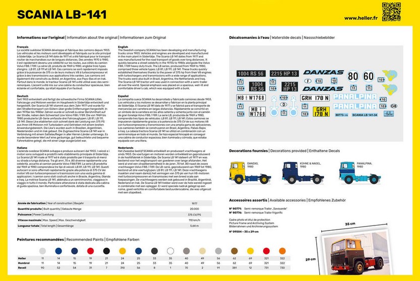 Seit 1903 entwickelt und fertigt die schwedische Firma SCANIA LKWs. Fahrzeuge und Motoren werden im Hauptwerk in Södertälje entwickelt und hergestellt. Der Scania LB 141 stammt aus dem Jahr 1977 und wurde für den Straßentransport von Gütern über große Entfernungen hergestellt. In den 1970er bis 1980er Jahren wurde er schnell zu einer Berühmtheit auf der Straße, neben dem Schwerlast Lkw Volvo F88 / F89. Die von 1969 bis 1980 produzierte LB-Serie umfasste drei Fahrzeugtypen: LB 81, LB 111, LB 141. Diese Lkw etablierten sich schnell dank der Leistung von 375 PS aus Ihren V8 Motoren mit Turboladern und Getrieben mit einem breiten Anwendungsbereich. Die Lkw?s wurden auch in Brasilien, Argentinien, Niederlanden und im Irak gebaut. Die Zugmaschine Scania LB 141 war in Verbindung mit einem Sattelauflieger in aller Herren Länder unterwegs. Es wurde besonderer Wert auf eine geräumige, gut beleuchtete und bequeme Fahrerkabine gelegt, die mit einer Liege ausgerüstet war.