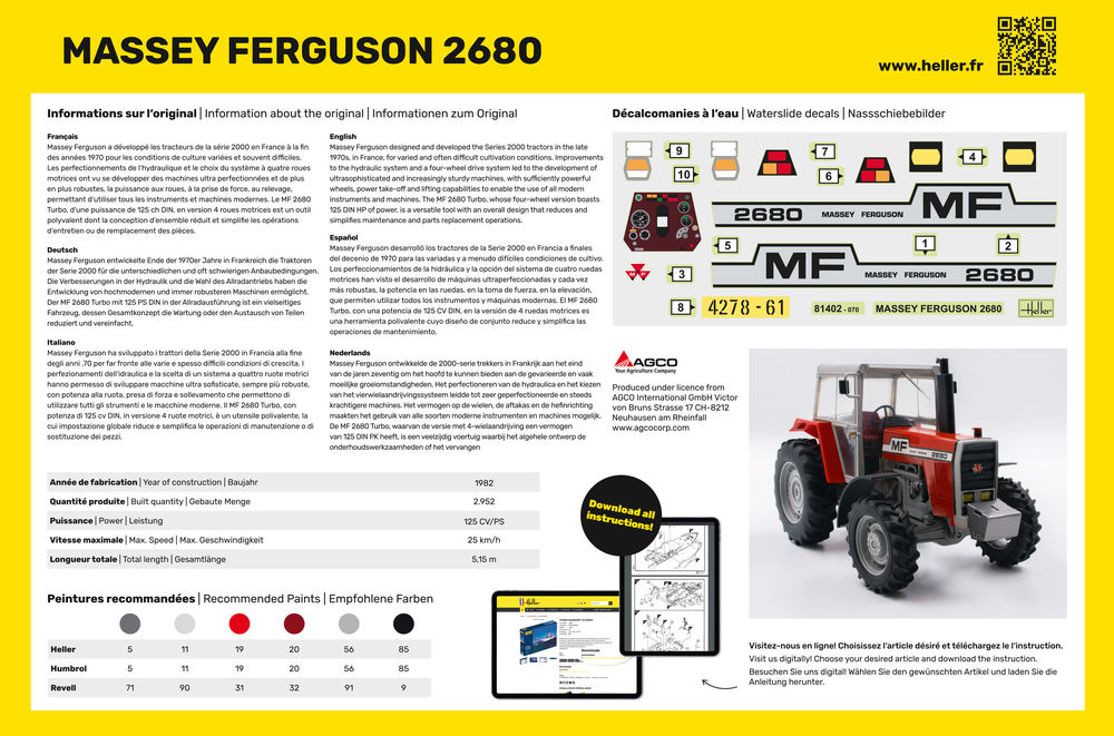 Massey Ferguson entwickelte Ende der 1970er Jahre in Frankreich die Traktoren der Serie 2000 für die unterschiedlichen und oft schwierigen Anbaubedingungen. Die Verbesserungen in der Hydraulik und die Wahl des Allradantriebs haben die Entwicklung von hochmodernen und immer robusteren Maschinen ermöglicht. Der MF 2680 Turbo mit 125 PS DIN in der Allradausführung ist ein vielseitiges Fahrzeug, dessen Gesamtkonzept die Wartung oder den Austausch von Teilen reduziert und vereinfacht.