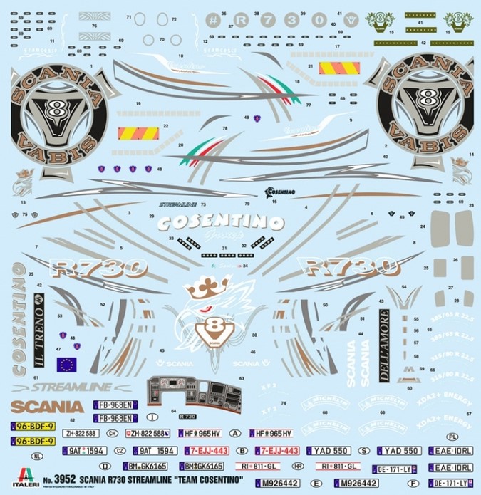 2005 lösten die schweren LKWs der Scania R-Reihe die Serie 4 ab. Die R-Trucks werden höchsten Ansprüchen an Kraftstoffverbrauch und Zuverlässigkeit gerecht, Scania-Motoren zeichnen sich durch Leistungsfähigkeit, Robustheit und Effizienz aus. Der V8-Motor des Topmodells R730 hat eine Leistung von 537 kW bei 1.900/min. Das markante Design verleiht dem Streamline Show Truck ein imposantes Erscheinungsbild auf der Straße, der schwedische Hersteller Scania gilt nicht umsonst als die Nummer eins in Sachen Show Trucks. Das außergewöhnliche Styling des Äußeren wird mit exklusiven Interieurs kombiniert, die Komfort für den Fahrer und eine breite Palette an Farb- und Materialoptionen bieten. Das Italeri-Kit enthält viele verchromte Kunststoffteile, die den R730 besonders realistisch wirken lassen. Ergänzt wird der Bausatz durch ein umfangreiches Dekors.