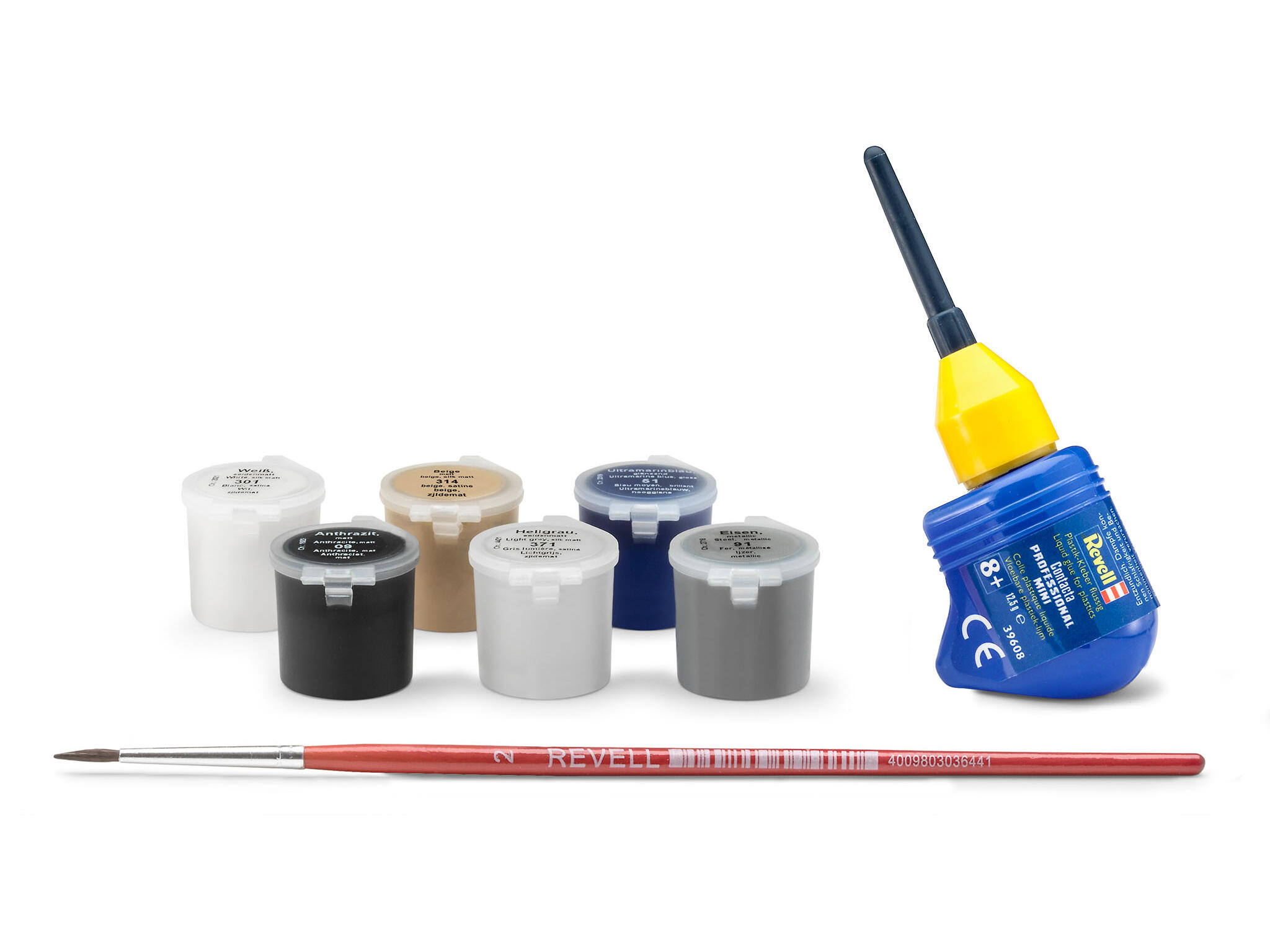 Kunststoffmodellbausatz (nicht zusammengebaut) Bebilderte, mehrsprachige Bauanleitung Abziehbilder Basisfarben (Revell Aqua Color) Klebstoff (Revell Contacta Professional Mini) Pinsel