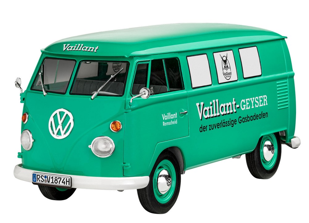 Hochdetaillierter Modellbausatz des VW T1 im Vaillant Design inklusive Farben, Kleber und Pinsel. Maßstab 1:24. 128 Teile. 180 mm Länge. Geeignet ab 13 Jahren.