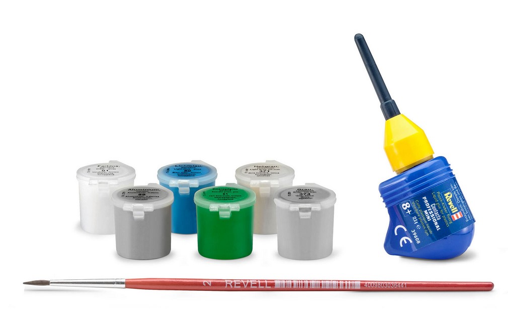 Kunststoffmodellbausatz (nicht zusammengebaut) Bebilderte, mehrsprachige Bauanleitung Abziehbilder Basisfarben (Revell Aqua Color) Klebstoff (Revell Contacta Professional Mini) Pinsel
