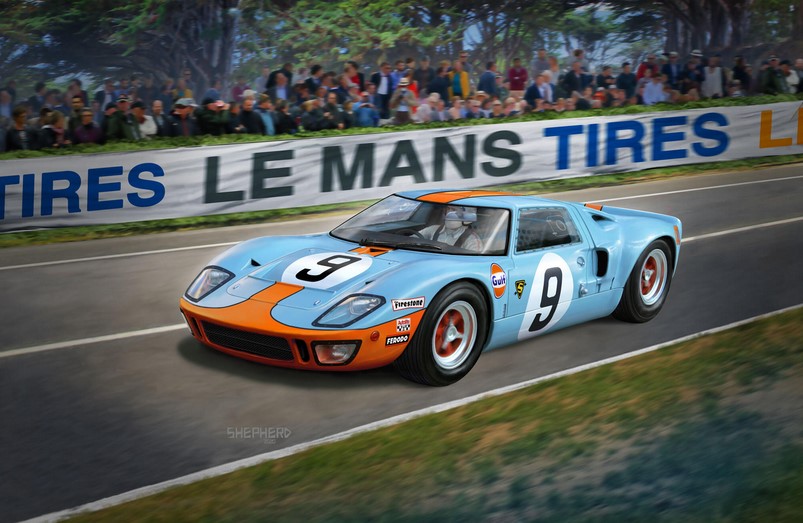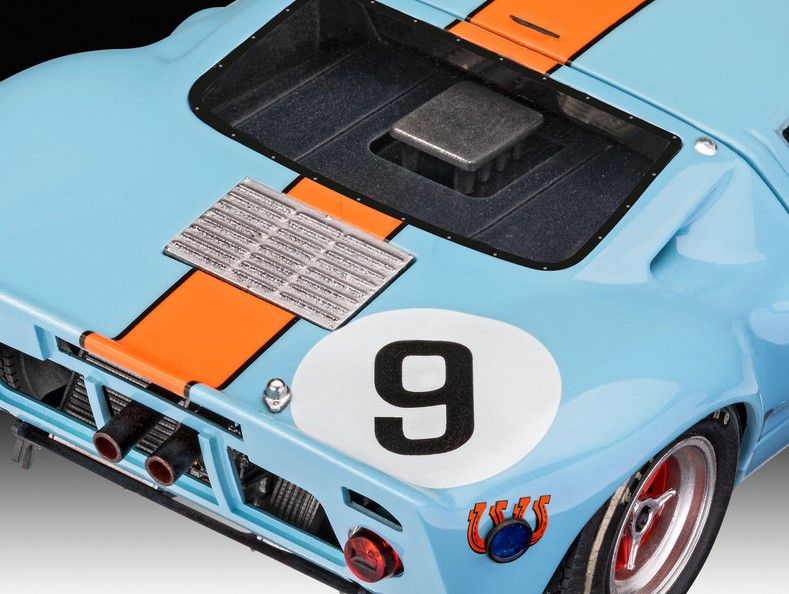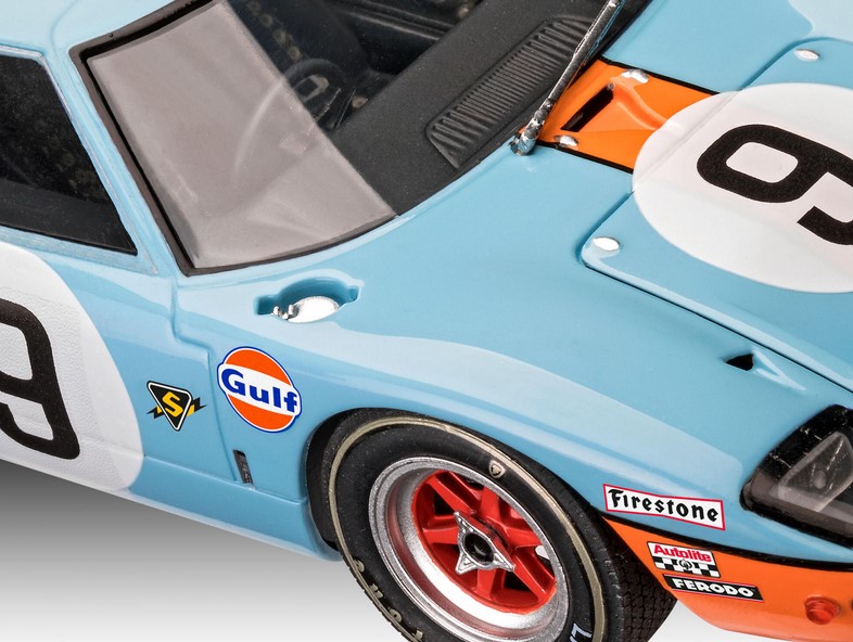 1968 war Ford mit dem GT40 wieder in Le Mans, dem härtesten Straßenrennen der Welt, erfolgreich. Mit dem erneuten Gesamtsieg 1969 hatte der GT40 damit die 24-Stunden viermal hintereinander für sich entschieden. - Mehrteilige Karosserie - Drehbare Räder - Authentische Abziehbilder für die Siegerfahrzeuge von 1968 & 1969