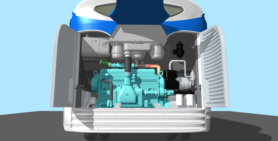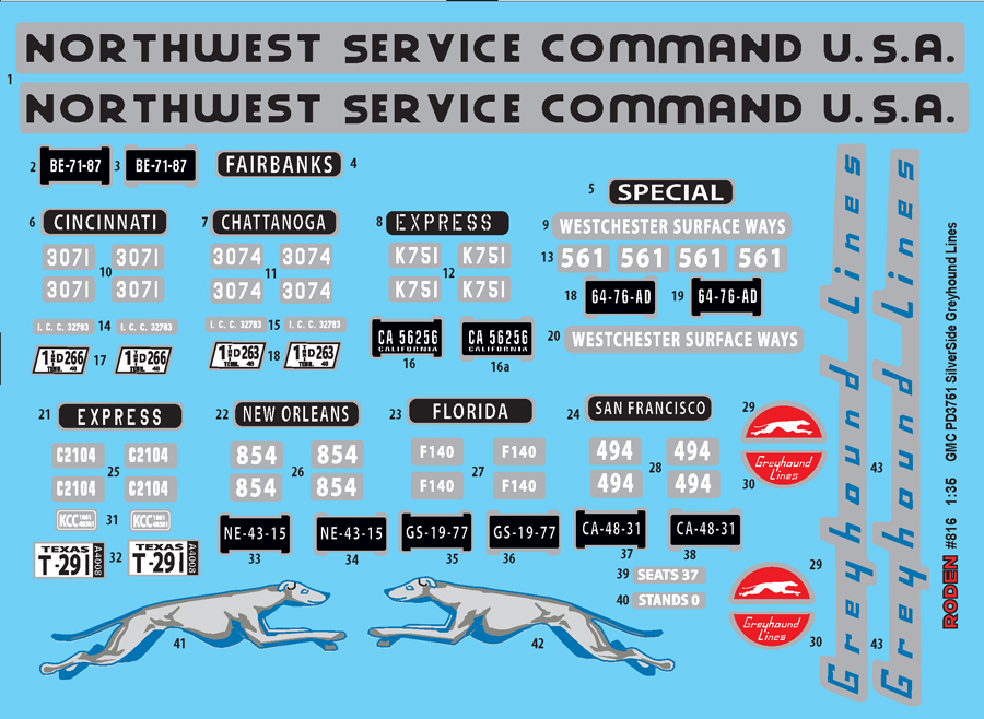 In den späten 1930er Jahren entwickelte das Team um den Designer Raymond Lowy mehrere Designprojekte für die Greyhound Busse. Es entstand ein völlig neuer Bus aus modernen Materialien wie Aluminium und Edelstahl. Auch das Design wich von allem Bekannten ab. 1939 wurde zur Weltausstellung in New York der erste Prototyp präsentiert - dies war der Urvater des markanten Designs der Greyhound Busse. Ende der 1940er Jahre entstand der neue PD3751 aus der Silversides Serie - P steht für Parlor (Salon/Überlandbus), das D für Diesel. Die 37 für die Anzahl der Sitze und die 51 ist die Seriennummer. Der Bus in seiner silber/blauen Lackierung wurde auf den Überlandlinien im gesamten Land eingesetzt. Roden bringt den PD3751 als detaillierten Bausatz im Maßstab 1/35 auf den Markt.