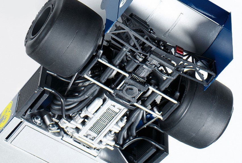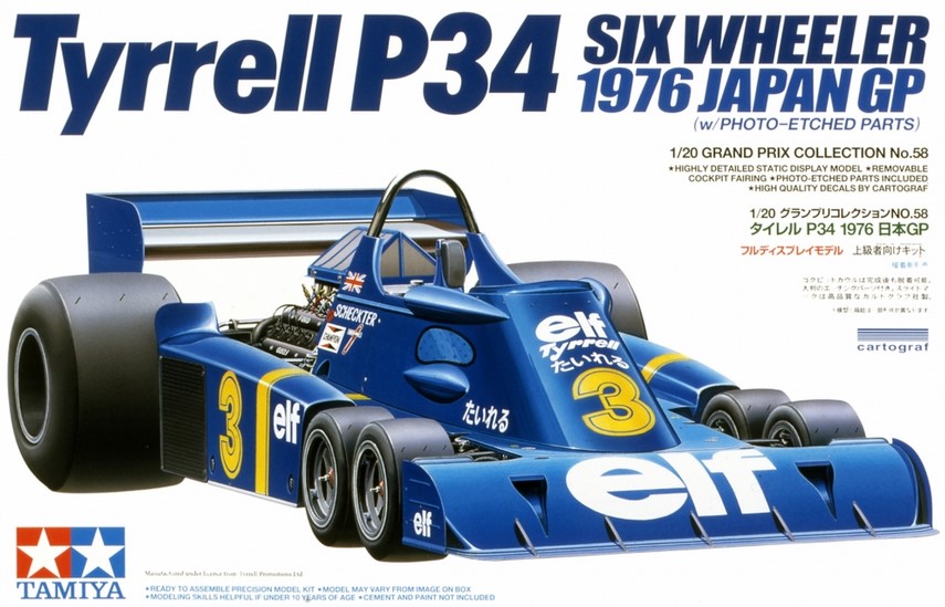 The Tyrrell P34 caused a sensation within the F1 world when it was unveiled in 1975. It sought to enhance braking and cornering performance by reducing the size of the drag-inducing front tires while preserving contact patch area through the use of 4 tires, thereby creating the only 6-wheeled machine in F1 history.The Tyrrell P34 appeared at the 1976 Japanese GP in an overall blue livery, with the car numbers and body side stripes in yellow and sponsor markings written in white. Team and driver names were also written in Japanese specifically for this race.
