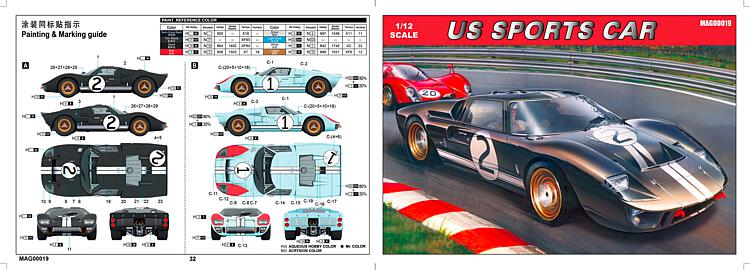 Trumpeter 05403: 1/12 Ford GT40 Mk.II. Plastikmodellbausatz eines US-amerikanischen Sportwagens. Hier als Version der 24 Stunden von Le Mans, 1966. 310 Teile, Metall- und Photoätzteilen. Länge gebaut 349 mm / Breite 151,7 mm / Höhe 86,3 mm.