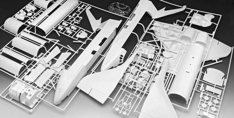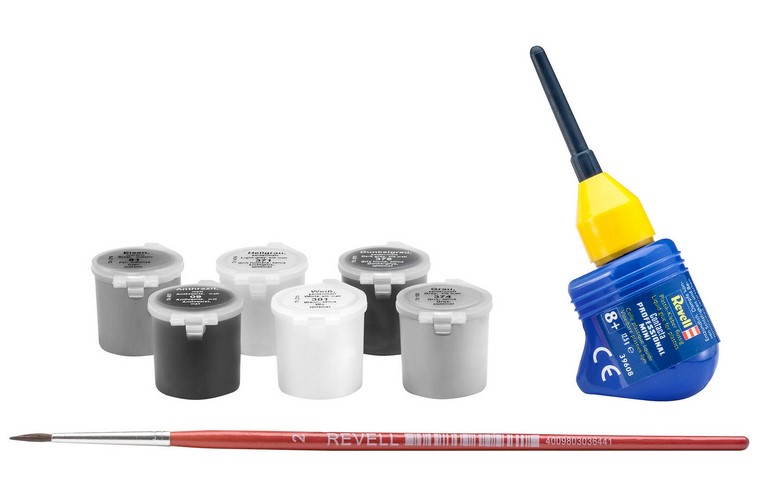 Kunststoffmodellbausatz (nicht zusammengebaut) Bebilderte, mehrsprachige Bauanleitung Abziehbilder Farben (Revell Aqua Color) Pinsel Klebstoff (Revell Contacta Professional Mini)
