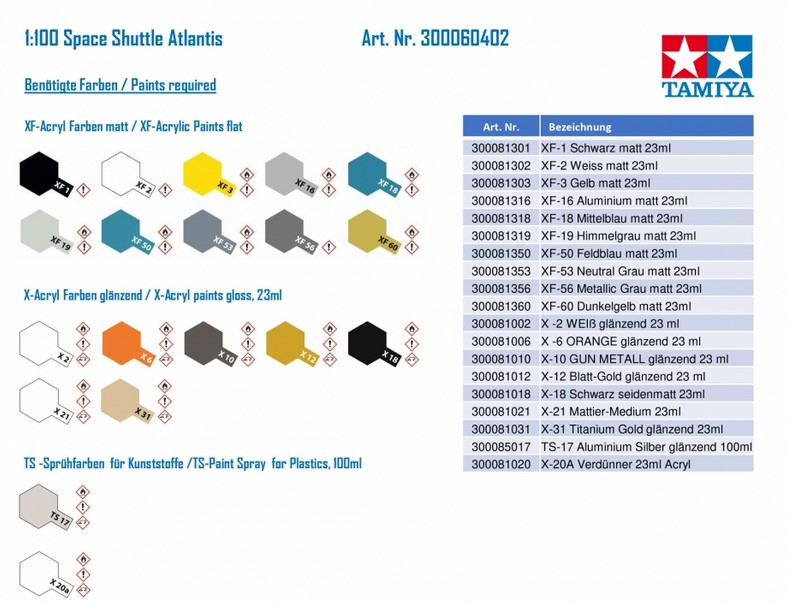 Das Standmodell ist eine Nachempfindung des Space Shuttles Atlantis, welches erstmals am 12. April 1981 von der NASA gestartet wurde. Dieses Shuttle führte während seiner 30-jährigen Dienstzeit zahlreiche historische Missionen durch wie z.B. den Bau der Internationalen Raumstation. Die letzte Mission führte die Atlantis am 21. Juli 2011 durch. Die gesamte Shuttle-Flotte soll nun in US Museen ausgestellt werden. Die TAMIYA Modellbaukasten-version besticht durch hohe Passgenauigkeit als auch durch Detailtreue.