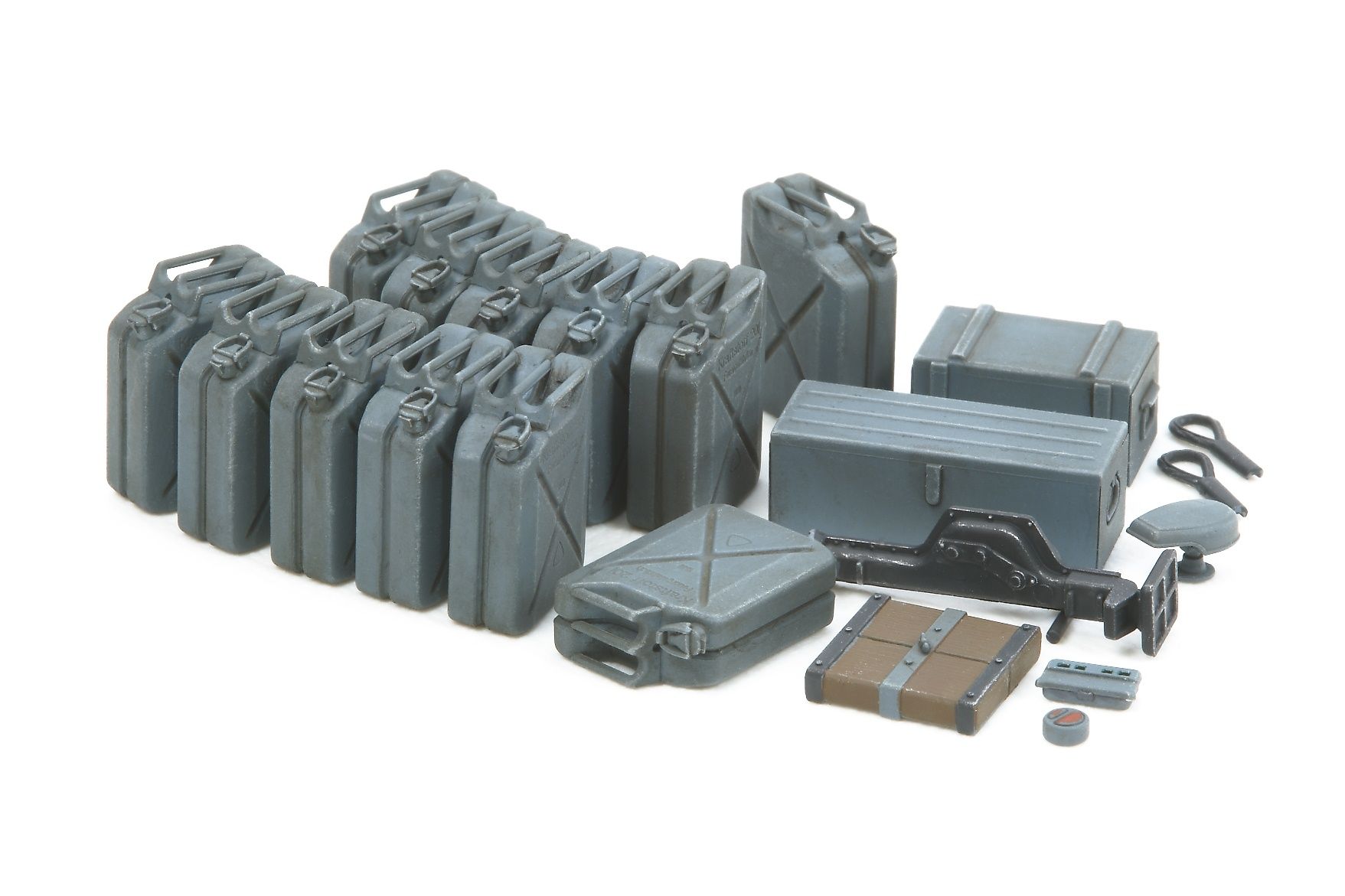 Set contains 12 early type Jerry Cans, 2 types of storage boxes, a notek light, and a jack with its base.
