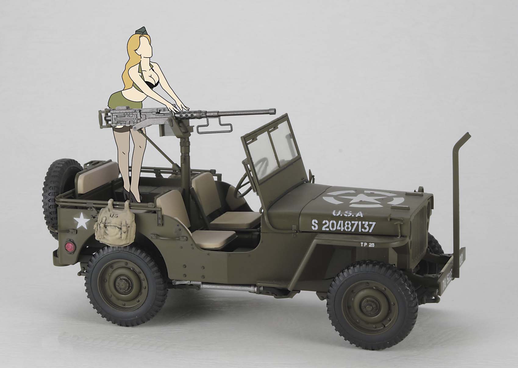Frau. Plastikmodellbausatz eines USamerikanischen WWII Jeeps mit 147 Teilen und