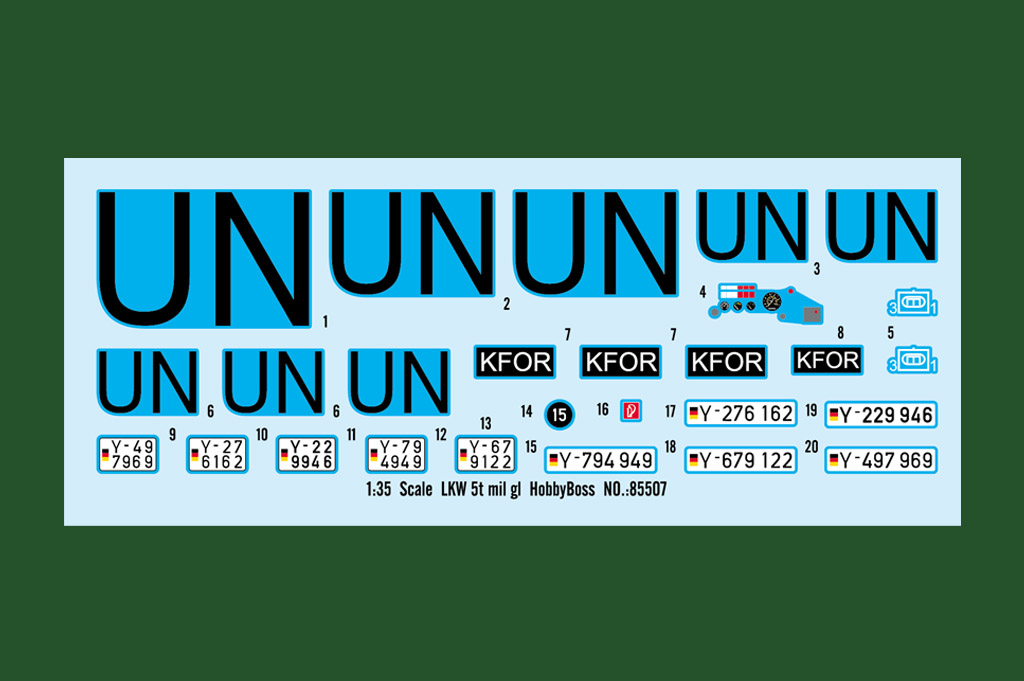 Plastikmodellbausatz eines deutschen Militär-LKW`s aus den 1960er Jahren mit 520 Teilen, Photoätzteilen und Gummireifen. Decos deutscher KFOR-Truppen. Länge gebaut 229 mm / Breite 71,4 mm.