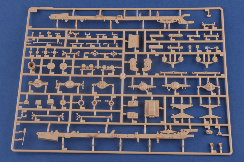 Plastikmodellbausatz eines schweren US-amerikanischen Trucks mit Schwerlastanhänger. 700 Teile, Photoätzteile und Gummireifen. Länge gebaut 626,3 mm / Breite 96 mm.
