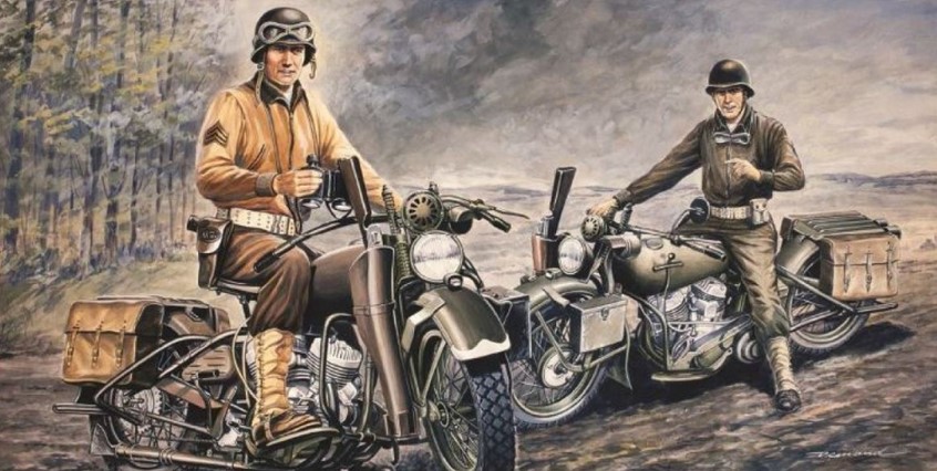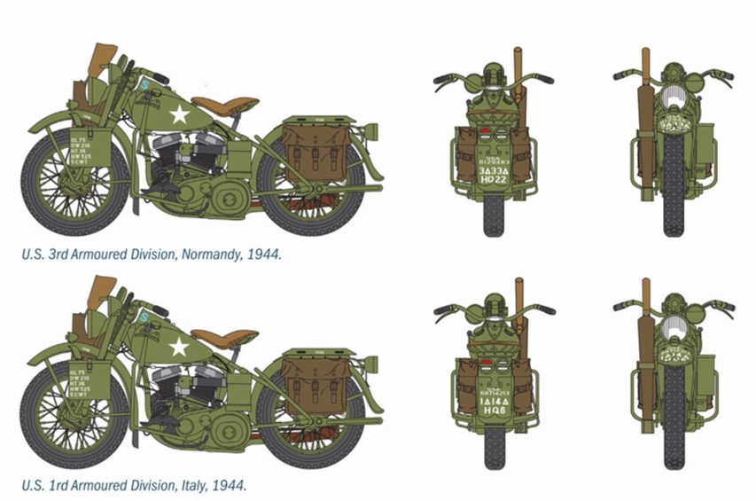 Das Standmodell ist eine Nachempfindung von US Soldaten auf 2 Motorrädern während des zweiten Weltkrieges. Fronttruppen setzten diese Motorräder auch für ihre Militärpolizei ein, um den Verkehr zu lenken und die Truppenbewegungen zu kontrollieren. Die Italeri Modellbaukastenversion besticht durch Passgenauigkeit als auch durch die Detailtreue.