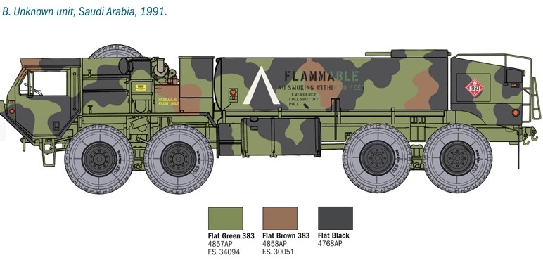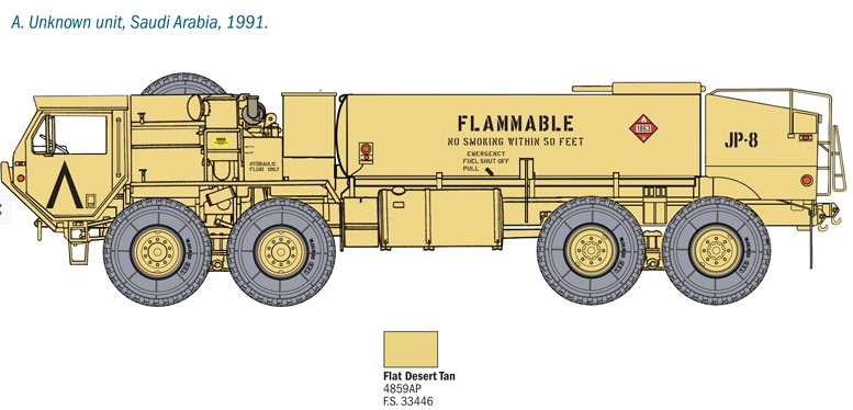 Das Standmodell ist eine Nachempfindung des US M978 Fuel Service Truck. Das Akronym HEMTT (Heavy Expanded Mobility Tactical Truck) kennzeichnet einen geländegängigen Geländewagen mit Achtradantrieb, der ab Mitte der 80er Jahre für die US-Armee hergestellt wurde. Dank seiner Eigenschaften kann der HEMTT eine hervorragende Geländemobilität und eine signifikante Transportleistung garantieren. Es ist das wahre "Arbeitstier" der Armee geworden, das in der Lage ist, Munition und Ausrüstung auf sehr effektive Weise zu transportieren. Die ausgestatteten Versionen, wie der M978 Tanker, wurden entwickelt, um die unterschiedlichen militärischen Logistikanforderungen auf sehr präzise und effektive Weise zu erfüllen. Dank der Ladekapazität von über 9.500 Litern kann der im Fahrzeug installierte Tank eine erhebliche Menge Kraftstoff transportieren. Der M978 wurde von den USA effektiv eingesetzt. Armee in verschiedenen schweren Einsatzgebieten wie dem Irak und Afghanistan.